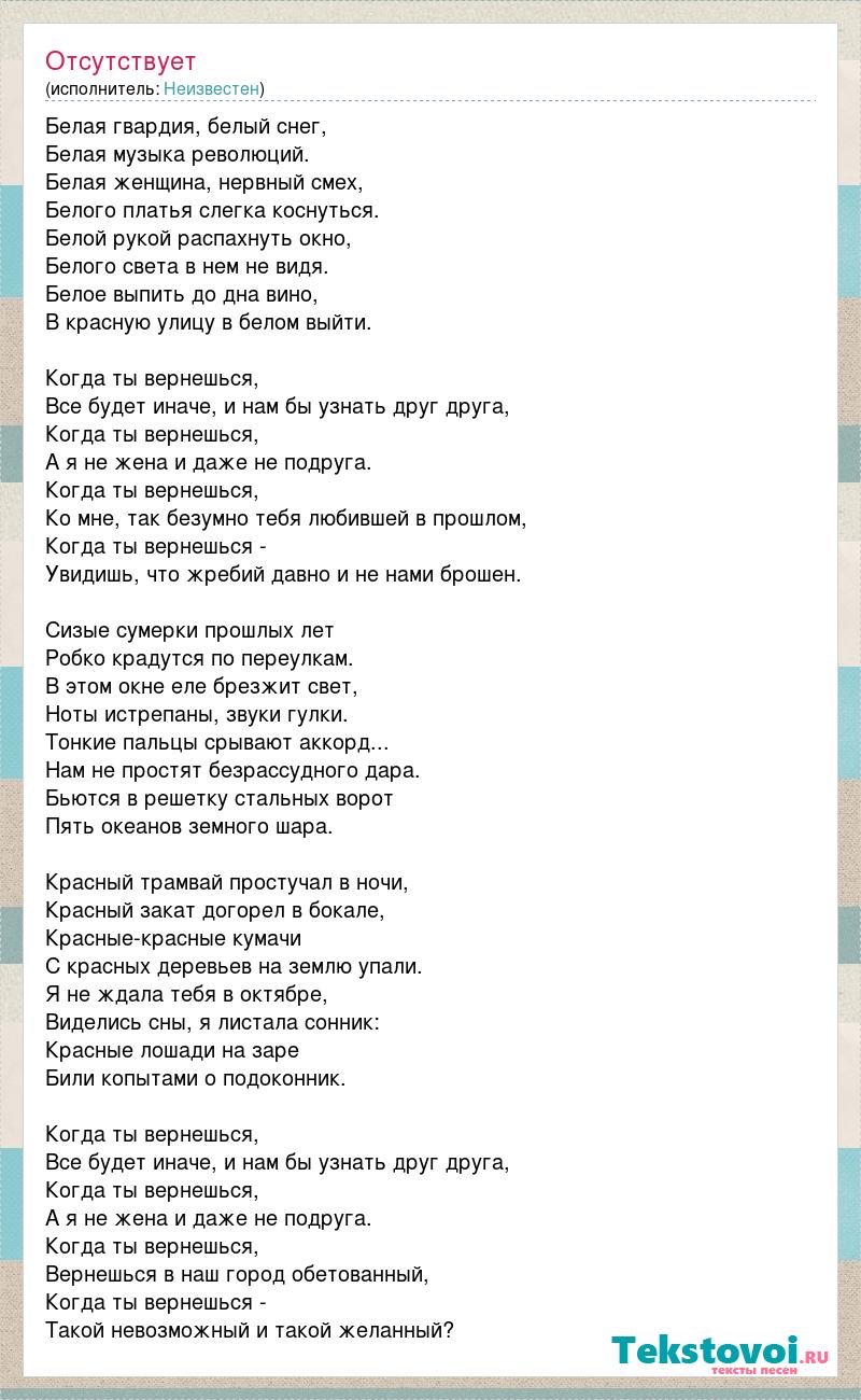Белая гвардия, белый снег, Белая музыка революций. Белая женщина, нервный смех, Белого платья слегка коснуться. Белой рукой распахнуть окно, Белого света в нем не видя. Белое выпить до дна вино, В красную улицу в белом выйти. Когда ты вернешься, Все будет иначе, и нам бы узнать друг друга, Когда ты вернешься, А я не жена и даже не подруга. Когда ты вернешься, Ко мне, так безумно тебя любившей в прошлом, Когда ты вернешься - Увидишь, что жребий давно и не нами брошен. Сизые сумерки прошлых лет Робко крадутся по переулкам. В этом окне еле брезжит свет, Ноты истрепаны, звуки гулки. Тонкие пальцы срывают аккорд... Нам не простят безрассудного дара. Бьются в решетку стальных ворот Пять океанов земного шара. Красный трамвай простучал в ночи, Красный закат догорел в бокале, Красные-красные кумачи С красных деревьев на землю упали. Я не ждала тебя в октябре, Виделись сны, я листала сонник: Красные лошади на заре Били копытами о подоконник. Когда ты вернешься, Все будет иначе, и нам бы узнать друг друга, Когда ты вернешься, А я не жена и даже не подруга. Когда ты вернешься, Вернешься в наш город обетованный, Когда ты вернешься - Такой невозможный и такой желанный?