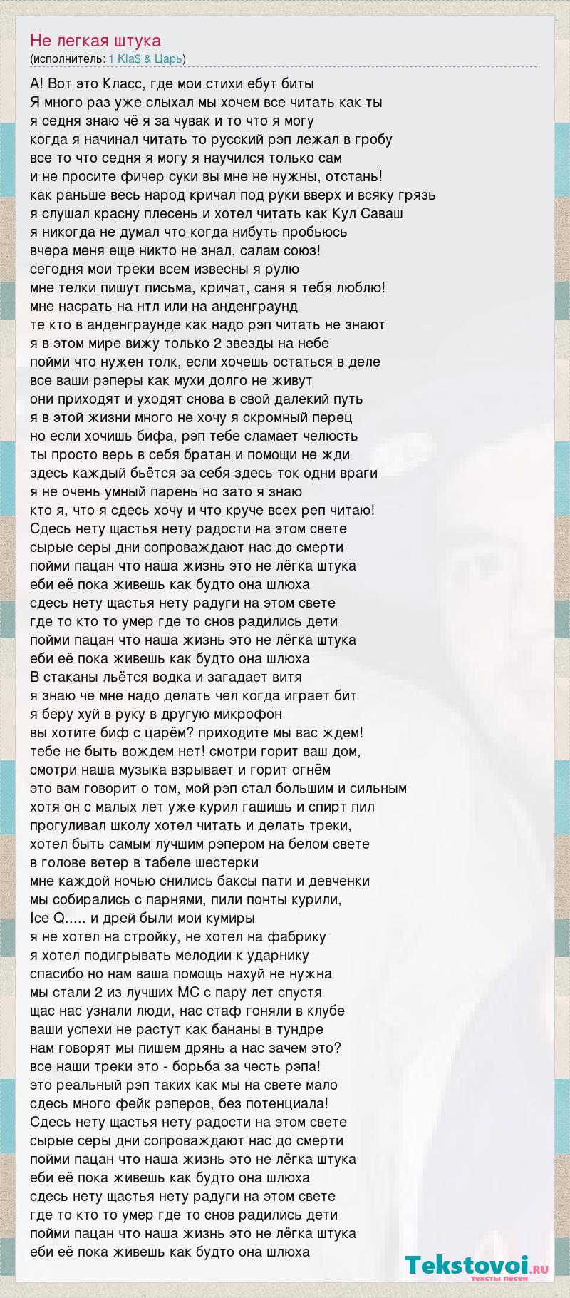 А! Вот это Класс, где мои стихи ебут биты Я много раз уже слыхал мы хочем все читать как ты я седня знаю чё я за чувак и то что я могу когда я начинал читать то русский рэп лежал в гробу все то что седня я могу я научился только сам и не просите фичер суки вы мне не нужны, отстань! как раньше весь народ кричал под руки вверх и всяку грязь я слушал красну плесень и хотел читать как Кул Саваш я никогда не думал что когда нибуть пробьюсь вчера меня еще никто не знал, салам союз! сегодня мои треки всем извесны я рулю мне телки пишут письма, кричат, саня я тебя люблю! мне насрать на нтл или на анденграунд те кто в анденграунде как надо рэп читать не знают я в этом мире вижу только 2 звезды на небе пойми что нужен толк, если хочешь остаться в деле все ваши рэперы как мухи долго не живут они приходят и уходят снова в свой далекий путь я в этой жизни много не хочу я скромный перец но если хочишь бифа, рэп тебе сламает челюсть ты просто верь в себя братан и помощи не жди здесь каждый бьётся за себя здесь ток одни враги я не очень умный парень но зато я знаю кто я, что я сдесь хочу и что круче всех реп читаю! Сдесь нету щастья нету радости на этом свете сырые серы дни сопроваждают нас до смерти пойми пацан что наша жизнь это не лёгка штука еби её пока живешь как будто она шлюха сдесь нету щастья нету радуги на этом свете где то кто то умер где то снов радились дети пойми пацан что наша жизнь это не лёгка штука еби её пока живешь как будто она шлюха В стаканы льётся водка и загадает витя я знаю че мне надо делать чел когда играет бит я беру хуй в руку в другую микрофон вы хотите биф с царём? приходите мы вас ждем! тебе не быть вождем нет! смотри горит ваш дом, смотри наша музыка взрывает и горит огнём это вам говорит о том, мой рэп стал большим и сильным хотя он с малых лет уже курил гашишь и спирт пил прогуливал школу хотел читать и делать треки, хотел быть самым лучшим рэпером на белом свете в голове ветер в табеле шестерки мне каждой ночью снились баксы пати и девченки мы собирались с парнями, пили понты курили, Ice Q..... и дрей были мои кумиры я не хотел на стройку, не хотел на фабрику я хотел подигрывать мелодии к ударнику спасибо но нам ваша помощь нахуй не нужна мы стали 2 из лучших МС с пару лет спустя щас нас узнали люди, нас стаф гоняли в клубе ваши успехи не растут как бананы в тундре нам говорят мы пишем дрянь а нас зачем это? все наши треки это - борьба за честь рэпа! это реальный рэп таких как мы на свете мало сдесь много фейк рэперов, без потенциала! Сдесь нету щастья нету радости на этом свете сырые серы дни сопроваждают нас до смерти пойми пацан что наша жизнь это не лёгка штука еби её пока живешь как будто она шлюха сдесь нету щастья нету радуги на этом свете где то кто то умер где то снов радились дети пойми пацан что наша жизнь это не лёгка штука еби её пока живешь как будто она шлюха