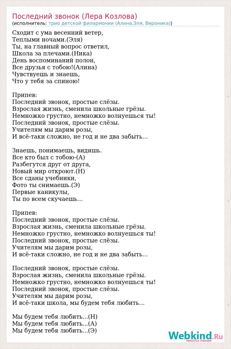 Сходит с ума весенний ветер, Теплыми ночами.(Эля) Ты, на главный вопрос ответил, Школа за плечами.(Ника) День воспоминаний полон, Все друзья с тобою!(Алина) Чувствуешь и знаешь, Что у тебя за спиною! Припев: Последний звонок, простые слёзы. Взрослая жизнь, сменила школьные грёзы. Немножко грустно, немножко волнуешься ты! Последний звонок, простые слёзы. Учителям мы дарим розы, И всё-таки сложно, не год и не два забыть… Знаешь, понимаешь, видишь. Все кто был с тобою-(А) Разбегутся друг от друга, Новый мир откроют.(Н) Все сданы учебники, Фото ты снимаешь.(Э) Первые каникулы, Ты по всем скучаешь… Припев: Последний звонок, простые слёзы. Взрослая жизнь, сменила школьные грёзы. Немножко грустно, немножко волнуешься ты! Последний звонок, простые слёзы. Учителям мы дарим розы, И всё-таки сложно, не год и не два забыть… Последний звонок, простые слёзы. Взрослая жизнь, сменила школьные грёзы. Немножко грустно, немножко волнуешься ты! Последний звонок, простые слёзы. Учителям мы дарим розы, И всё-таки школа, мы будем тебя любить… Мы будем тебя любить...(Н) Мы будем тебя любить...(А) Мы будем тебя любить...(Э)