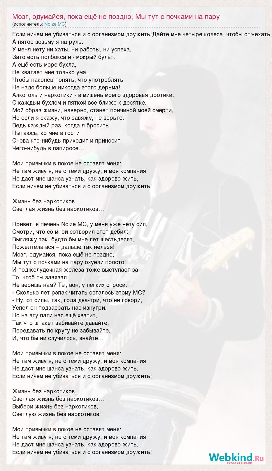 Если ничем не убиваться и с организмом дружить!Дайте мне четыре колеса, чтобы отъехать, А пятое возьму я на руль. У меня нету ни хаты, ни работы, ни успеха, Зато есть полбокса и «мокрый буль». А ещё есть море бухла, Не хватает мне только ума, Чтобы наконец понять, что употреблять Не надо больше никогда этого дерьма! Алкоголь и наркотики - в мишень моего здоровья дротики: С каждым бухлом и пяткой все ближе к десятке. Мой образ жизни, наверно, станет причиной моей смерти, Но если я скажу, что завяжу, не верьте. Ведь каждый раз, когда я бросить Пытаюсь, ко мне в гости Снова кто-нибудь приходит и приносит Чего-нибудь в папиросе… Мои привычки в покое не оставят меня: Не там живу я, не с теми дружу, и моя компания Не даст мне шанса узнать, как здорово жить, Если ничем не убиваться и с организмом дружить! Жизнь без наркотиков… Светлая жизнь без наркотиков… Привет, я печень Noize MC, у меня уже нету сил, Смотри, что со мной сотворил этот дебил: Выгляжу так, будто бы мне лет шестьдесят, Пожелтела вся – дальше так нельзя! Мозг, одумайся, пока ещё не поздно, Мы тут с почками на пару охуели просто! И поджелудочная железа тоже выступает за То, чтоб ты завязал. Не веришь нам? Ты, вон, у лёгких спроси: - Сколько лет рэпак читать осталось этому МС? - Ну, от силы, так, года два-три, что ни говори, Успел он подзасрать нас изнутри. Но на эту пати нас ещё хватит, Так что штакет забивайте давайте, Передавать по кругу не забывайте, И, что бы ни случилось, знайте… Мои привычки в покое не оставят меня: Не там живу я, не с теми дружу, и моя компания Не даст мне шанса узнать, как здорово жить, Если ничем не убиваться и с организмом дружить! Жизнь без наркотиков… Светлая жизнь без наркотиков… Выбери жизнь без наркотиков, Светлую жизнь без наркотиков! Мои привычки в покое не оставят меня: Не там живу я, не с теми дружу, и моя компания Не даст мне шанса узнать, как здорово жить, Если ничем не убиваться и с организмом дружить!