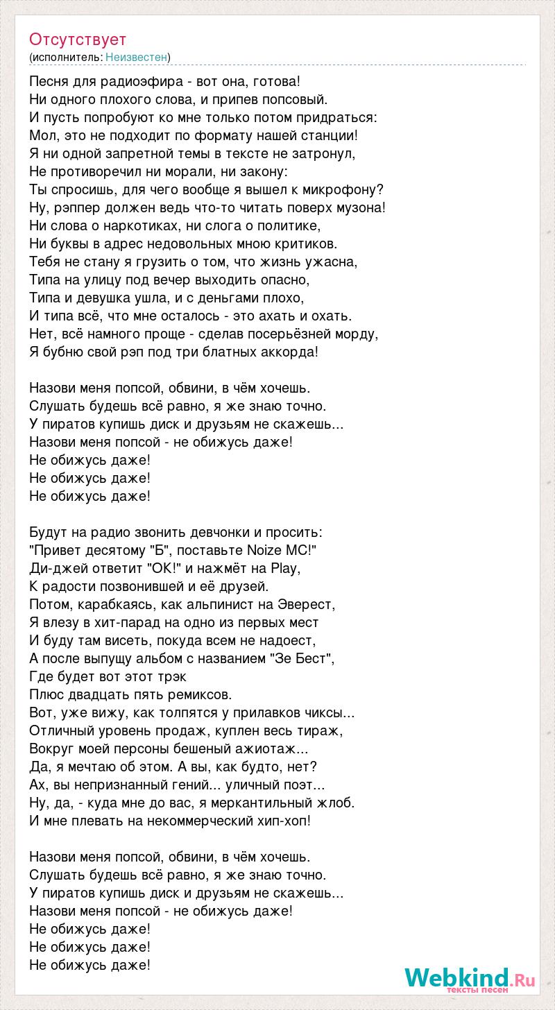 Песня для радиоэфира - вот она, готова! Ни одного плохого слова, и припев попсовый. И пусть попробуют ко мне только потом придраться: Мол, это не подходит по формату нашей станции! Я ни одной запретной темы в тексте не затронул, Не противоречил ни морали, ни закону: Ты спросишь, для чего вообще я вышел к микрофону? Ну, рэппер должен ведь что-то читать поверх музона! Ни слова о наркотиках, ни слога о политике, Ни буквы в адрес недовольных мною критиков. Тебя не стану я грузить о том, что жизнь ужасна, Типа на улицу под вечер выходить опасно, Типа и девушка ушла, и с деньгами плохо, И типа всё, что мне осталось - это ахать и охать. Нет, всё намного проще - сделав посерьёзней морду, Я бубню свой рэп под три блатных аккорда! Назови меня попсой, обвини, в чём хочешь. Слушать будешь всё равно, я же знаю точно. У пиратов купишь диск и друзьям не скажешь... Назови меня попсой - не обижусь даже! Не обижусь даже! Не обижусь даже! Не обижусь даже! Будут на радио звонить девчонки и просить: "Привет десятому "Б", поставьте Noize MC!" Ди-джей ответит "ОК!" и нажмёт на Play, К радости позвонившей и её друзей. Потом, карабкаясь, как альпинист на Эверест, Я влезу в хит-парад на одно из первых мест И буду там висеть, покуда всем не надоест, А после выпущу альбом с названием "Зе Бест", Где будет вот этот трэк Плюс двадцать пять ремиксов. Вот, уже вижу, как толпятся у прилавков чиксы... Отличный уровень продаж, куплен весь тираж, Вокруг моей персоны бешеный ажиотаж... Да, я мечтаю об этом. А вы, как будто, нет? Ах, вы непризнанный гений... уличный поэт... Ну, да, - куда мне до вас, я меркантильный жлоб. И мне плевать на некоммерческий хип-хоп! Назови меня попсой, обвини, в чём хочешь. Слушать будешь всё равно, я же знаю точно. У пиратов купишь диск и друзьям не скажешь... Назови меня попсой - не обижусь даже! Не обижусь даже! Не обижусь даже! Не обижусь даже!