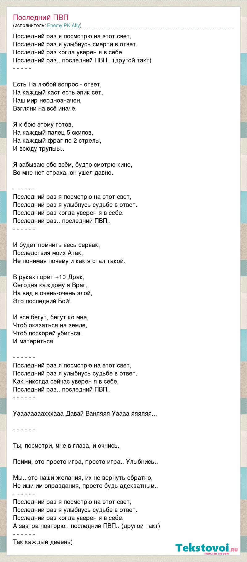 Последний раз я посмотрю на этот свет, Последний раз я улыбнусь смерти в ответ. Последний раз когда уверен я в себе. Последний раз.. последний ПВП.. (другой такт) - - - - - Есть На любой вопрос - ответ, На каждый каст есть эпик сет, Наш мир неоднозначен, Взгляни на всё иначе. Я к бою этому готов, На каждый палец 5 скилов, На каждый фраг по 2 стрелы, И всюду трупыы.. Я забываю обо всём, будто смотрю кино, Во мне нет страха, он ушел давно. - - - - - - Последний раз я посмотрю на этот свет, Последний раз я улыбнусь судьбе в ответ. Последний раз когда уверен я в себе. Последний раз.. последний ПВП.. - - - - - - И будет помнить весь сервак, Последствия моих Атак, Не понимая почему и как я стал такой. В руках горит +10 Драк, Сегодня каждому я Враг, На вид я очень-очень злой, Это последний Бой! И все бегут, бегут ко мне, Чтоб оказаться на земле, Чтоб поскорей убиться.. И материться. - - - - - - Последний раз я посмотрю на этот свет, Последний раз я улыбнусь судьбе в ответ. Как никогда сейчас уверен я в себе. Последний раз.. последний ПВП.. - - - - - - Уаааааааахххааа Давай Ваняяяя Уаааа яяяяяя... - - - - - - Ты, посмотри, мне в глаза, и очнись. Пойми, это просто игра, просто игра.. Улыбнись.. Мы.. это наши желания, их не вернуть обратно, Не ищи им оправдания, просто будь адекватным.. - - - - - - Последний раз я посмотрю на этот свет, Последний раз я улыбнусь судьбе в ответ. Последний раз когда уверен я в себе. А завтра повторю.. последний ПВП.. (другой такт) - - - - - - Так каждый дееень)