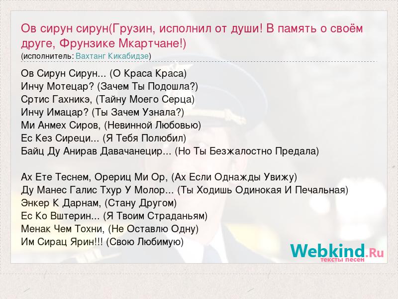 Ов Сирун Сирун... (О Краса Краса) Инчу Мотецар? (Зачем Ты Подошла?) Сртис Гахникэ, (Тайну Моего Серца) Инчу Имацар? (Ты Зачем Узнала?) Ми Анмех Сиров, (Невинной Любовью) Ес Кез Сиреци... (Я Тебя Полюбил) Байц Ду Анирав Давачанецир... (Но Ты Безжалостно Предала) Ах Ете Теснем, Орериц Ми Ор, (Ах Если Однажды Увижу) Ду Манес Галис Тхур У Молор... (Ты Ходишь Одинокая И Печальная) Энкер К Дарнам, (Стану Другом) Ес Ко Вштерин... (Я Твоим Страданьям) Менак Чем Тохни, (Не Оставлю Одну) Им Сирац Ярин!!! (Свою Любимую)