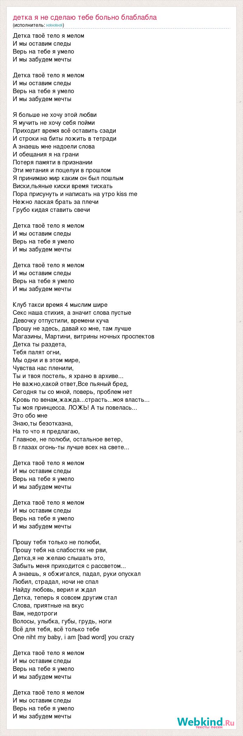 Детка твоё тело я мелом И мы оставим следы Верь на тебе я умело И мы забудем мечты Детка твоё тело я мелом И мы оставим следы Верь на тебе я умело И мы забудем мечты Я больше не хочу этой любви Я мучить не хочу себя пойми Приходит время всё оставить сзади И строки на биты ложить в тетради А знаешь мне надоели слова И обещания я на грани Потеря памяти в признании Эти метания и поцелуи в прошлом Я принимаю мир каким он был пошлым Виски,пьяные киски время тискать Пора присунуть и написать на утро kiss me Нежно лаская брать за плечи Грубо кидая ставить свечи Детка твоё тело я мелом И мы оставим следы Верь на тебе я умело И мы забудем мечты Детка твоё тело я мелом И мы оставим следы Верь на тебе я умело И мы забудем мечты Клуб такси время 4 мыслим шире Секс наша стихия, а значит слова пустые Девочку отпустили, времени куча Прошу не здесь, давай ко мне, там лучше Магазины, Мартини, витрины ночных проспектов Детка ты раздета, Тебя палят огни, Мы одни и в этом мире, Чувства нас пленили, Ты и твоя постель, я храню в архиве... Не важно,какой ответ,Все пьяный бред, Сегодня ты со мной, поверь, проблем нет Кровь по венам,жажда...страсть...моя власть... Ты моя принцесса. ЛОЖЬ! А ты повелась... Это обо мне Знаю,ты безотказна, На то что я предлагаю, Главное, не полюби, остальное ветер, В глазах огонь-ты лучше всех на свете... Детка твоё тело я мелом И мы оставим следы Верь на тебе я умело И мы забудем мечты Детка твоё тело я мелом И мы оставим следы Верь на тебе я умело И мы забудем мечты Прошу тебя только не полюби, Прошу тебя на слабостях не рви, Детка,я не желаю слышать это, Забыть меня приходится с рассветом... А знаешь, я обжигался, падал, руки опускал Любил, страдал, ночи не спал Найду любовь, верил и ждал Детка, теперь я совсем другим стал Слова, приятные на вкус Вам, недотроги Волосы, улыбка, губы, грудь, ноги Всё для тебя, всё только тебе One niht my baby, i am [bad word] you crazy Детка твоё тело я мелом И мы оставим следы Верь на тебе я умело И мы забудем мечты Детка твоё тело я мелом И мы оставим следы Верь на тебе я умело И мы забудем мечты