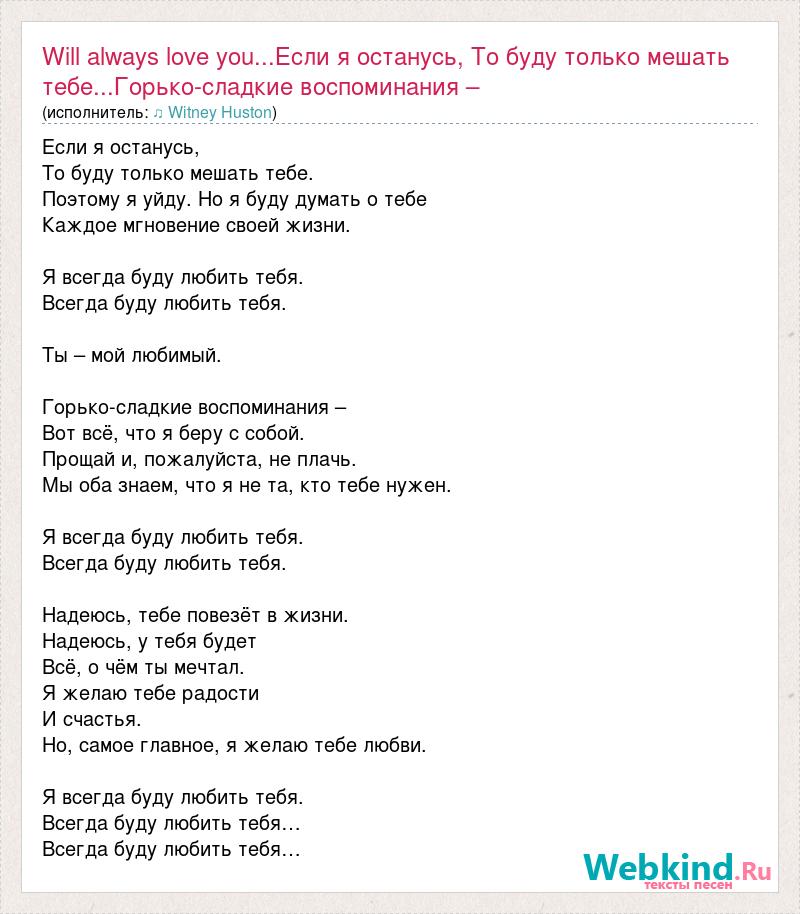 Если я останусь, То буду только мешать тебе. Поэтому я уйду. Но я буду думать о тебе Каждое мгновение своей жизни. Я всегда буду любить тебя. Всегда буду любить тебя. Ты – мой любимый. Горько-сладкие воспоминания – Вот всё, что я беру с собой. Прощай и, пожалуйста, не плачь. Мы оба знаем, что я не та, кто тебе нужен. Я всегда буду любить тебя. Всегда буду любить тебя. Надеюсь, тебе повезёт в жизни. Надеюсь, у тебя будет Всё, о чём ты мечтал. Я желаю тебе радости И счастья. Но, самое главное, я желаю тебе любви. Я всегда буду любить тебя. Всегда буду любить тебя… Всегда буду любить тебя…