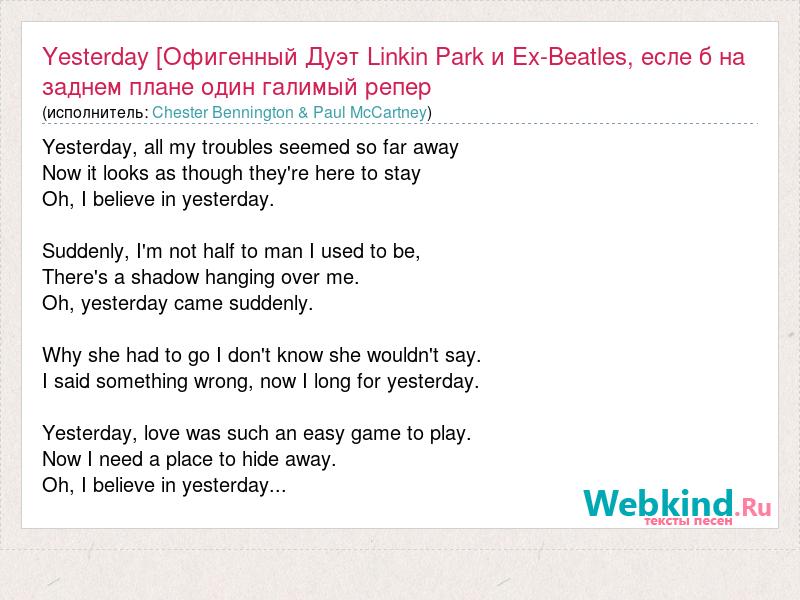 А как ты думаешь, о чем песня "Yesterday [Офигенный Дуэт Linkin Park и Ex-Beatles, есле б на заднем плане" ?