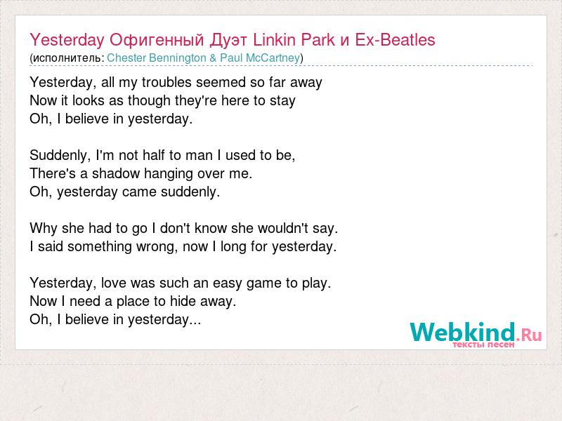 Yesterday, all my troubles seemed so far away Now it looks as though they're here to stay Oh, I believe in yesterday. Suddenly, I'm not half to man I used to be, There's a shadow hanging over me. Oh, yesterday came suddenly. Why she had to go I don't know she wouldn't say. I said something wrong, now I long for yesterday. Yesterday, love was such an easy game to play. Now I need a place to hide away. Oh, I believe in yesterday...