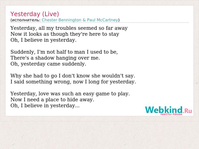 Yesterday, all my troubles seemed so far away Now it looks as though they're here to stay Oh, I believe in yesterday. Suddenly, I'm not half to man I used to be, There's a shadow hanging over me. Oh, yesterday came suddenly. Why she had to go I don't know she wouldn't say. I said something wrong, now I long for yesterday. Yesterday, love was such an easy game to play. Now I need a place to hide away. Oh, I believe in yesterday...