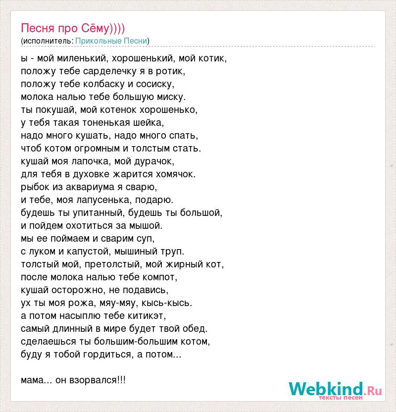 ы - мой миленький, хорошенький, мой котик, положу тебе сарделечку я в ротик, положу тебе колбаску и сосиску, молока налью тебе большую миску. ты покушай, мой котенок хорошенько, у тебя такая тоненькая шейка, надо много кушать, надо много спать, чтоб котом огромным и толстым стать. кушай моя лапочка, мой дурачок, для тебя в духовке жарится хомячок. рыбок из аквариума я сварю, и тебе, моя лапусенька, подарю. будешь ты упитанный, будешь ты большой, и пойдем охотиться за мышой. мы ее поймаем и сварим суп, с луком и капустой, мышиный труп. толстый мой, претолстый, мой жирный кот, после молока налью тебе компот, кушай осторожно, не подавись, ух ты моя рожа, мяу-мяу, кысь-кысь. а потом насыплю тебе китикэт, самый длинный в мире будет твой обед. сделаешься ты большим-большим котом, буду я тобой гордиться, а потом... мама... он взорвался!!!