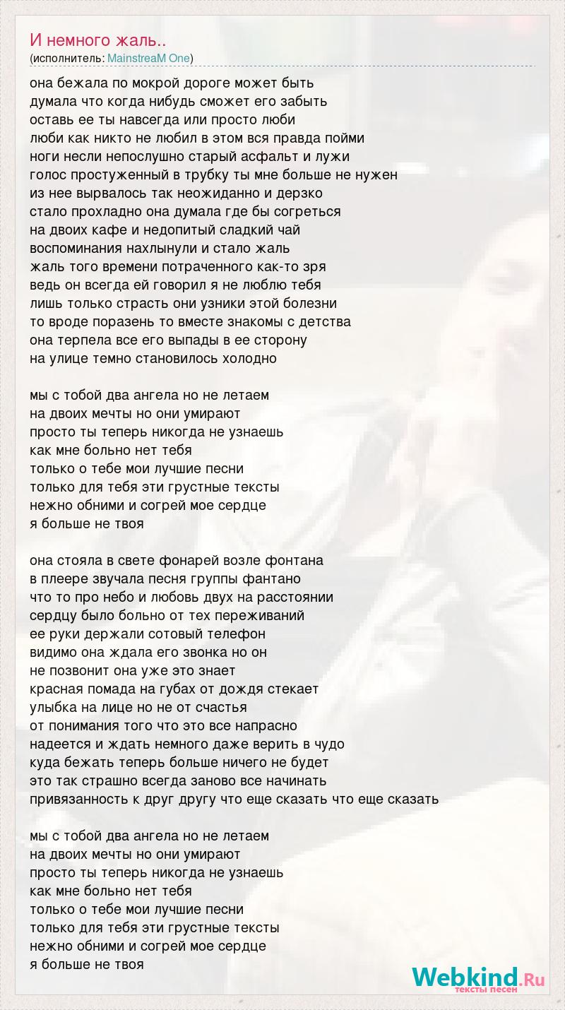 она бежала по мокрой дороге может быть думала что когда нибудь сможет его забыть оставь ее ты навсегда или просто люби люби как никто не любил в этом вся правда пойми ноги несли непослушно старый асфальт и лужи голос простуженный в трубку ты мне больше не нужен из нее вырвалось так неожиданно и дерзко стало прохладно она думала где бы согреться на двоих кафе и недопитый сладкий чай воспоминания нахлынули и стало жаль жаль того времени потраченного как-то зря ведь он всегда ей говорил я не люблю тебя лишь только страсть они узники этой болезни то вроде поразень то вместе знакомы с детства она терпела все его выпады в ее сторону на улице темно становилось холодно мы с тобой два ангела но не летаем на двоих мечты но они умирают просто ты теперь никогда не узнаешь как мне больно нет тебя только о тебе мои лучшие песни только для тебя эти грустные тексты нежно обними и согрей мое сердце я больше не твоя она стояла в свете фонарей возле фонтана в плеере звучала песня группы фантано что то про небо и любовь двух на расстоянии сердцу было больно от тех переживаний ее руки держали сотовый телефон видимо она ждала его звонка но он не позвонит она уже это знает красная помада на губах от дождя стекает улыбка на лице но не от счастья от понимания того что это все напрасно надеется и ждать немного даже верить в чудо куда бежать теперь больше ничего не будет это так страшно всегда заново все начинать привязанность к друг другу что еще сказать что еще сказать мы с тобой два ангела но не летаем на двоих мечты но они умирают просто ты теперь никогда не узнаешь как мне больно нет тебя только о тебе мои лучшие песни только для тебя эти грустные тексты нежно обними и согрей мое сердце я больше не твоя