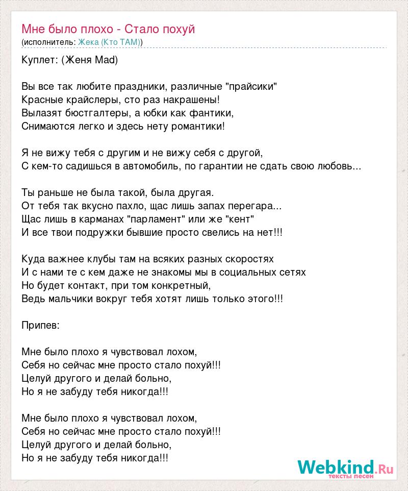 Куплет: (Женя Mad) Вы все так любите праздники, различные "прайсики" Красные крайслеры, сто раз накрашены! Вылазят бюстгалтеры, а юбки как фантики, Снимаются легко и здесь нету романтики! Я не вижу тебя с другим и не вижу себя с другой, С кем-то садишься в автомобиль, по гарантии не сдать свою любовь... Ты раньше не была такой, была другая. От тебя так вкусно пахло, щас лишь запах перегара... Щас лишь в карманах "парламент" или же "кент" И все твои подружки бывшие просто свелись на нет!!! Куда важнее клубы там на всяких разных скоростях И с нами те с кем даже не знакомы мы в социальных сетях Но будет контакт, при том конкретный, Ведь мальчики вокруг тебя хотят лишь только этого!!! Припев: Мне было плохо я чувствовал лохом, Себя но сейчас мне просто стало похуй!!! Целуй другого и делай больно, Но я не забуду тебя никогда!!! Мне было плохо я чувствовал лохом, Себя но сейчас мне просто стало похуй!!! Целуй другого и делай больно, Но я не забуду тебя никогда!!!