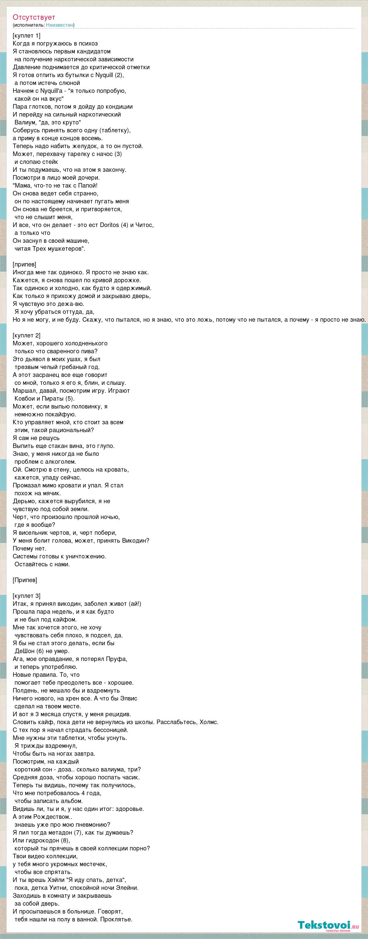 [куплет 1] Когда я погружаюсь в психоз Я становлюсь первым кандидатом на получение наркотической зависимости Давление поднимается до критической отметки Я готов отпить из бутылки с Nyquill (2), а потом истечь слюной Начнем с Nyquill'а - "я только попробую, какой он на вкус" Пара глотков, потом я дойду до кондиции И перейду на сильный наркотический Валиум, "да, это круто" Соберусь принять всего одну (таблетку), а приму в конце концов восемь. Теперь надо набить желудок, а то он пустой. Может, перехвачу тарелку с начос (3) и слопаю стейк И ты подумаешь, что на этом я закончу. Посмотри в лицо моей дочери. "Мама, что-то не так с Папой! Он снова ведет себя странно, он по настоящему начинает пугать меня Он снова не бреется, и притворяется, что не слышит меня, И все, что он делает - это ест Doritos (4) и Читос, а только что Он заснул в своей машине, читая Трех мушкетеров". [припев] Иногда мне так одиноко. Я просто не знаю как. Кажется, я снова пошел по кривой дорожке. Так одиноко и холодно, как будто я одержимый. Как только я прихожу домой и закрываю дверь, Я чувствую это дежа-вю. Я хочу убраться оттуда, да, Но я не могу, и не буду. Скажу, что пытался, но я знаю, что это ложь, потому что не пытался, а почему - я просто не знаю. [куплет 2] Может, хорошего холодненького только что сваренного пива? Это дьявол в моих ушах, я был трезвым челый гребаный год. А этот засранец все еще говорит со мной, только я его я, блин, и слышу. Маршал, давай, посмотрим игру. Играют Ковбои и Пираты (5). Может, если выпью половинку, я немножно покайфую. Кто управляет мной, кто стоит за всем этим, такой рациональный? Я сам не решусь Выпить еще стакан вина, это глупо. Знаю, у меня никогда не было проблем с алкоголем. Ой. Смотрю в стену, целюсь на кровать, кажется, упаду сейчас. Промазал мимо кровати и упал. Я стал похож на мячик. Дерьмо, кажется вырубился, я не чувствую под собой земли. Черт, что произошло прошлой ночью, где я вообще? Я висельник чертов, и, черт побери, У меня болит голова, может, принять Викодин? Почему нет. Системы готовы к уничтожению. Оставйтесь с нами. [Припев] [куплет 3] Итак, я принял викодин, заболел живот (ай!) Прошла пара недель, и я как будто и не был под кайфом. Мне так хочется этого, не хочу чувствовать себя плохо, я подсел, да. Я бы не стал этого делать, если бы ДеШон (6) не умер. Ага, мое оправдание, я потерял Пруфа, и теперь употребляю. Новые правила. То, что помогает тебе преодолеть все - хорошее. Полдень, не мешало бы и вздремнуть Ничего нового, на хрен все. А что бы Элвис сделал на твоем месте. И вот я 3 месяца спустя, у меня рецидив. Словить кайф, пока дети не вернулись из школы. Расслабьтесь, Холмс. С тех пор я начал страдать бессоницей. Мне нужны эти таблетки, чтобы уснуть. Я трижды вздремнул, Чтобы быть на ногах завтра. Посмотрим, на каждый короткий сон - доза.. сколько валиума, три? Средняя доза, чтобы хорошо поспать часик. Теперь ты видишь, почему так получилось, Что мне потребовалось 4 года, чтобы записать альбом. Видишь ли, ты и я, у нас один итог: здоровье. А этим Рождеством.. знаешь уже про мою пневмонию? Я пил тогда метадон (7), как ты думаешь? Или гидрокодон (8), который ты прячешь в своей коллекции порно? Твои видео коллекции, у тебя много укромных местечек, чтобы все спрятать. И ты врешь Хэйли "Я иду спать, детка", пока, детка Уитни, спокойной ночи Элейни. Заходишь в комнату и закрываешь за собой дверь. И просыпаешься в больниц