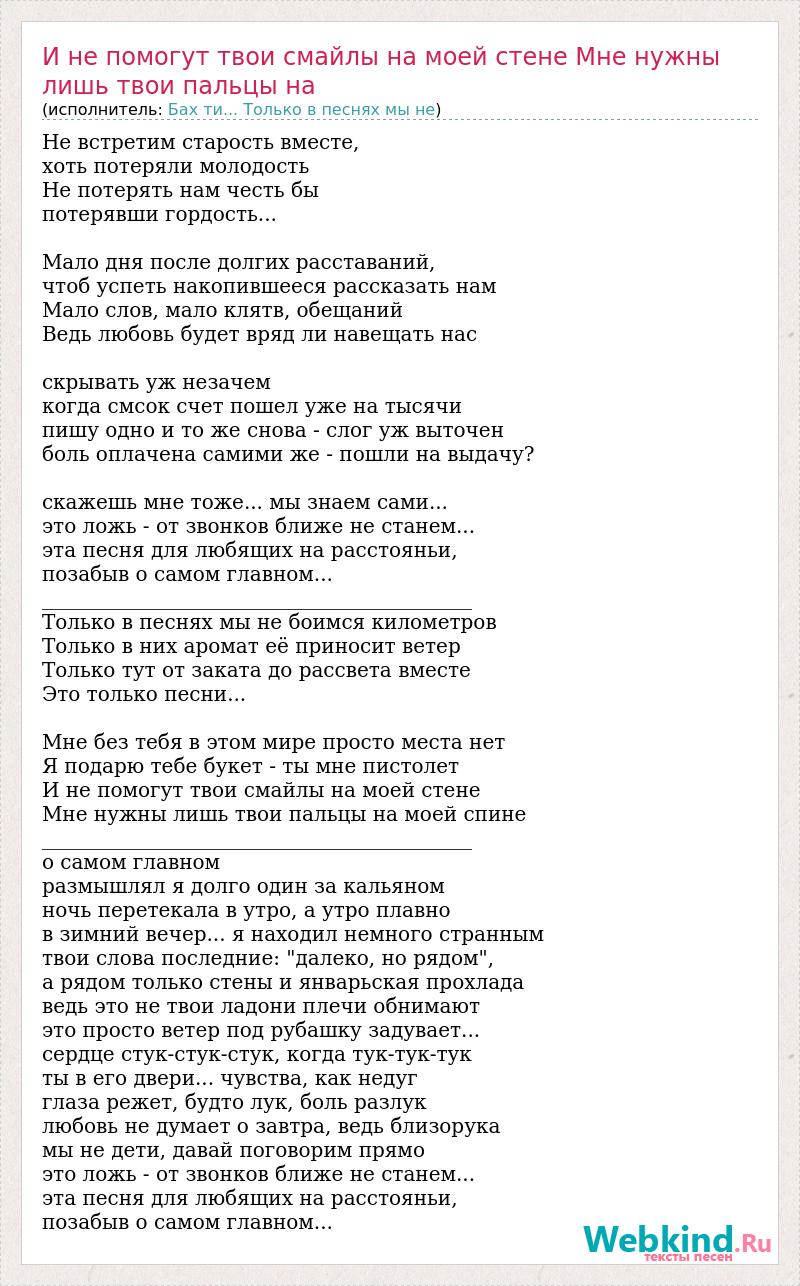 Главная→Исполнители→Бах ти... Только в песнях мы не→И не помогут твои смайлы на моей стене Мне нужны лишь твои пальцы на