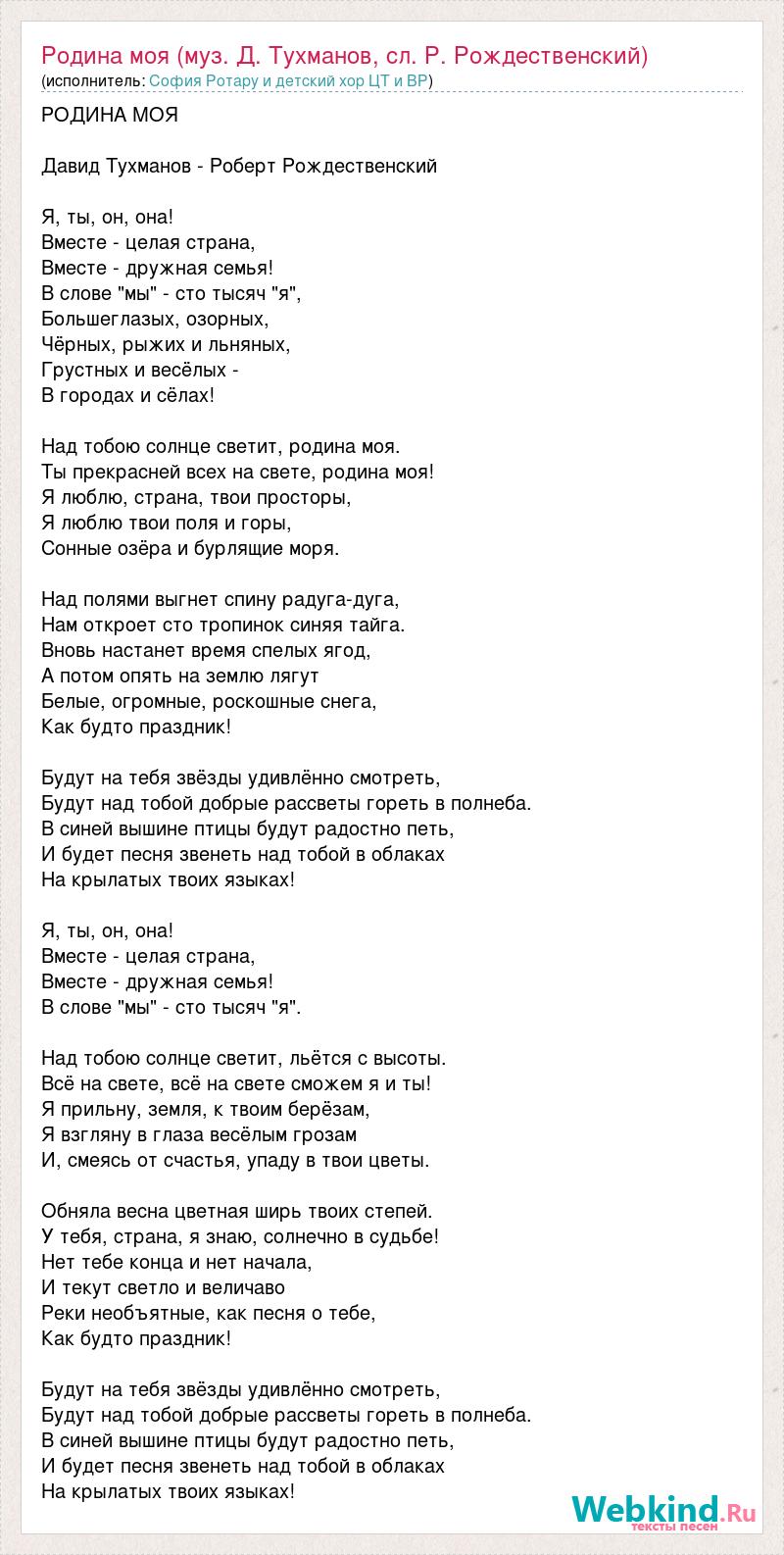 РОДИНА МОЯ Давид Тухманов - Роберт Рождественский Я, ты, он, она! Вместе - целая страна, Вместе - дружная семья! В слове "мы" - сто тысяч "я", Большеглазых, озорных, Чёрных, рыжих и льняных, Грустных и весёлых - В городах и сёлах! Над тобою солнце светит, родина моя. Ты прекрасней всех на свете, родина моя! Я люблю, страна, твои просторы, Я люблю твои поля и горы, Сонные озёра и бурлящие моря. Над полями выгнет спину радуга-дуга, Нам откроет сто тропинок синяя тайга. Вновь настанет время спелых ягод, А потом опять на землю лягут Белые, огромные, роскошные снега, Как будто праздник! Будут на тебя звёзды удивлённо смотреть, Будут над тобой добрые рассветы гореть в полнеба. В синей вышине птицы будут радостно петь, И будет песня звенеть над тобой в облаках На крылатых твоих языках! Я, ты, он, она! Вместе - целая страна, Вместе - дружная семья! В слове "мы" - сто тысяч "я". Над тобою солнце светит, льётся с высоты. Всё на свете, всё на свете сможем я и ты! Я прильну, земля, к твоим берёзам, Я взгляну в глаза весёлым грозам И, смеясь от счастья, упаду в твои цветы. Обняла весна цветная ширь твоих степей. У тебя, страна, я знаю, солнечно в судьбе! Нет тебе конца и нет начала, И текут светло и величаво Реки необъятные, как песня о тебе, Как будто праздник! Будут на тебя звёзды удивлённо смотреть, Будут над тобой добрые рассветы гореть в полнеба. В синей вышине птицы будут радостно петь, И будет песня звенеть над тобой в облаках На крылатых твоих языках!