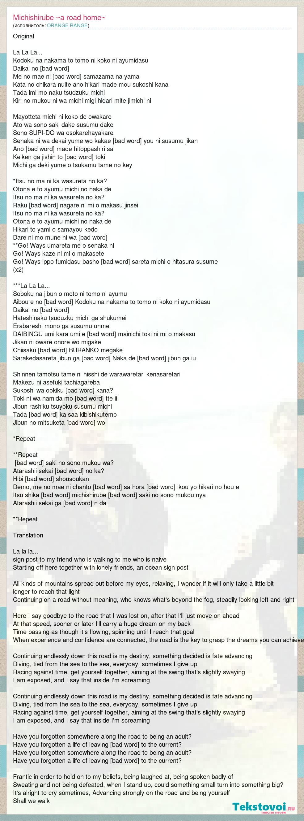 Original La La La... Kodoku na nakama to tomo ni koko ni ayumidasu Daikai no michishirube Me no mae ni hirogaru samazama na yama Kata no chikara nuite ano hikari made mou sukoshi kana Tada imi mo naku tsudzuku michi Kiri no mukou ni wa michi migi hidari mite jimichi ni Mayotteta michi ni koko de owakare Ato wa sono saki dake susumu dake Sono SUPI-DO wa osokarehayakare Senaka ni wa dekai yume wo kakae Nagareru you ni susumu jikan Ano GO-RU made hitoppashiri sa Keiken ga jishin to tsunagaru toki Michi ga deki yume o tsukamu tame no key *Itsu no ma ni ka wasureta no ka? Otona e to ayumu michi no naka de Itsu no ma ni ka wasureta no ka? Raku [bad word] nagare ni mi o makasu jinsei Itsu no ma ni ka wasureta no ka? Otona e to ayumu michi no naka de Hikari to yami o samayou kedo Dare ni mo mune ni wa michishirube **Go! Ways umareta me o senaka ni Go! Ways kaze ni mi o makasete Go! Ways ippo fumidasu basho Shiru sareta michi o hitasura susume (x2) ***La La La... Soboku na jibun o moto ni tomo ni ayumu Aibou e no michishirube Kodoku na nakama to tomo ni koko ni ayumidasu Daikai no michishirube Hateshinaku tsuduzku michi ga shukumei Erabareshi mono ga susumu unmei DAIBINGU umi kara umi e tsunagaru mainichi toki ni mi o makasu Jikan ni oware onore wo migake Chiisaku yureteru BURANKO megake Sarakedasareta jibun ga iru Naka de sakenderu jibun ga iu Shinnen tamotsu tame ni hisshi de warawaretari kenasaretari Makezu ni asefuki tachiagareba Sukoshi wa ookiku nareru kana? Toki ni wa namida mo [bad word] tte ii Jibun rashiku tsuyoku susumu michi Tada arukou ka saa kibishikutemo Jibun no mitsuketa michishirube wo *Repeat **Repeat Kasunderu saki no sono mukou wa? Atarashii sekai mieteru no ka? Hibi oshiyoseru shousoukan Demo, me no mae ni chanto aru sa hora Aruite ikou yo hikari no hou e Itsu shika tsunagaru michishirube Kasunderu saki no sono mukou nya Atarashii sekai ga mieteru n da **Repeat Translation La la la... sign post to my friend who is walking to me who is naive Starting off here together with lonely friends, an ocean sign post All kinds of mountains spread out before my eyes, relaxing, I wonder if it will only take a little bit longer to reach that light Continuing on a road without meaning, who knows what's beyond the fog, steadily looking left and right Here I say goodbye to the road that I was lost on, after that I'll just move on ahead At that speed, sooner or later I'll carry a huge dream on my back Time passing as though it's flowing, spinning until I reach that goal When experience and confidence are connected, the road is the key to grasp the dreams you can achieve Continuing endlessly down this road is my destiny, something decided is fate advancing Diving, tied from the sea to the sea, everyday, sometimes I give up Racing against time, get yourself together, aiming at the swing that's slightly swaying I am exposed, and I say that inside I'm screaming Continuing endlessly down this road is my destiny, something decided is fate advancing Diving, tied from the sea to the sea, everyday, sometimes I give up Racing against time, get yourself together, aiming at the swing that's slightly swaying I am exposed, and I say that inside I'm screaming Have you forgotten somewhere along the road to being an adult? Have you forgotten a life of leaving truth to the current? Have you forgotten somewhere along the road to being an adult? Have you forgotten a life of leaving truth to the current? Frantic in order to hold on to my beliefs, being laughed at, being spoken badly of Sweating and not being defeated, when I stand up, could something small turn into something big? It's alright to cry sometimes, Advancing strongly on the road and being yourself Shall we walk