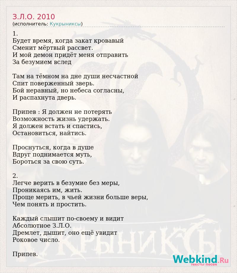 1. Будет время, когда закат кровавый Сменит мёртвый рассвет. И мой демон придёт меня отправить За безумием вслед Там на тёмном на дне души несчастной Спит поверженный зверь. Бой неравный, но небеса согласны, И распахнута дверь. Припев : Я должен не потерять Возможность жизнь удержать. Я должен встать и спастись, Остановиться, найтись. Проснуться, когда в душе Вдруг поднимается муть, Бороться за свою суть. 2. Легче верить в безумие без меры, Проникаясь им, жить. Проще мерить, в чьей жизни больше веры, Чем понять и простить. Каждый слышит по-своему и видит Абсолютное З.Л.О. Дремлет, дышит, оно ещё увидит Роковое число. Припев.