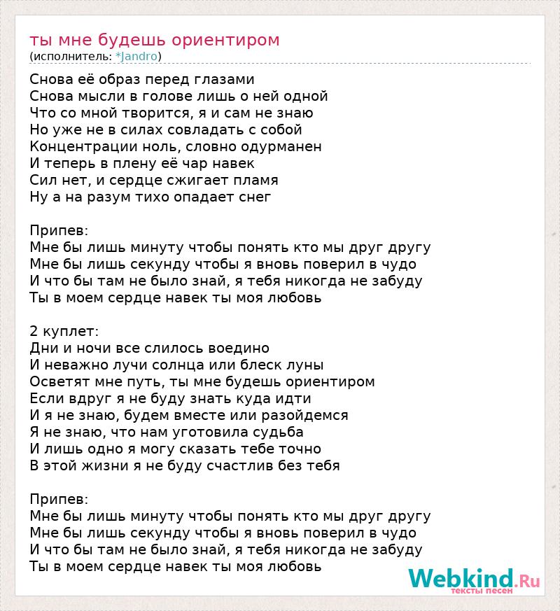 Снова её образ перед глазами Снова мысли в голове лишь о ней одной Что со мной творится, я и сам не знаю Но уже не в силах совладать с собой Концентрации ноль, словно одурманен И теперь в плену её чар навек Сил нет, и сердце сжигает пламя Ну а на разум тихо опадает снег Припев: Мне бы лишь минуту чтобы понять кто мы друг другу Мне бы лишь секунду чтобы я вновь поверил в чудо И что бы там не было знай, я тебя никогда не забуду Ты в моем сердце навек ты моя любовь 2 куплет: Дни и ночи все слилось воедино И неважно лучи солнца или блеск луны Осветят мне путь, ты мне будешь ориентиром Если вдруг я не буду знать куда идти И я не знаю, будем вместе или разойдемся Я не знаю, что нам уготовила судьба И лишь одно я могу сказать тебе точно В этой жизни я не буду счастлив без тебя Припев: Мне бы лишь минуту чтобы понять кто мы друг другу Мне бы лишь секунду чтобы я вновь поверил в чудо И что бы там не было знай, я тебя никогда не забуду Ты в моем сердце навек ты моя любовь