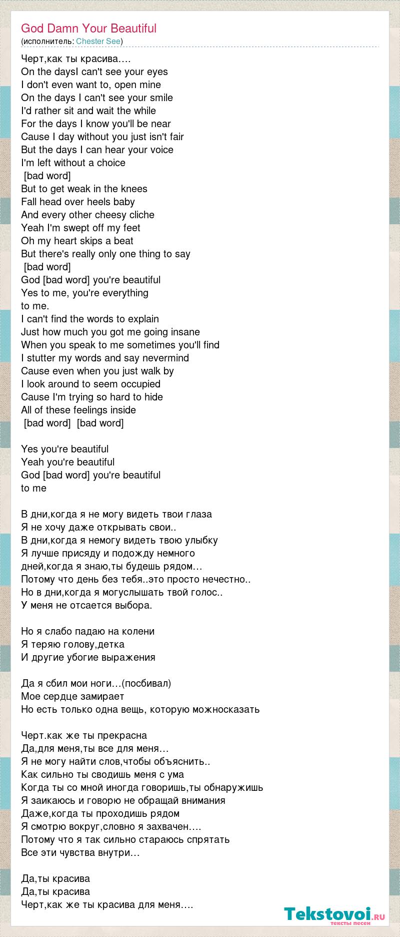 Черт,как ты красива…. On the daysI can't see your eyes I don't even want to, open mine On the days I can't see your smile I'd rather sit and wait the while For the days I know you'll be near Cause I day without you just isn't fair But the days I can hear your voice I'm left without a choice Pre-Chorus But to get weak in the knees Fall head over heels baby And every other cheesy cliche Yeah I'm swept off my feet Oh my heart skips a beat But there's really only one thing to say Chorus God [bad word] you're beautiful Yes to me, you're everything to me. I can't find the words to explain Just how much you got me going insane When you speak to me sometimes you'll find I stutter my words and say nevermind Cause even when you just walk by I look around to seem occupied Cause I'm trying so hard to hide All of these feelings inside Pre-Chorus Chorus Yes you're beautiful Yeah you're beautiful God [bad word] you're beautiful to me В дни,когда я не могу видеть твои глаза Я не хочу даже открывать свои.. В дни,когда я немогу видеть твою улыбку Я лучше присяду и подожду немного дней,когда я знаю,ты будешь рядом… Потому что день без тебя..это просто нечестно.. Но в дни,когда я могуслышать твой голос.. У меня не отсается выбора. Но я слабо падаю на колени Я теряю голову,детка И другие убогие выражения Да я сбил мои ноги…(посбивал) Мое сердце замирает Но есть только одна вещь, которую можносказать Черт.как же ты прекрасна Да,для меня,ты все для меня… Я не могу найти слов,чтобы объяснить.. Как сильно ты сводишь меня с ума Когда ты со мной иногда говоришь,ты обнаружишь Я заикаюсь и говорю не обращай внимания Даже,когда ты проходишь рядом Я смотрю вокруг,словно я захвачен…. Потому что я так сильно стараюсь спрятать Все эти чувства внутри… Да,ты красива Да,ты красива Черт,как же ты красива для меня….