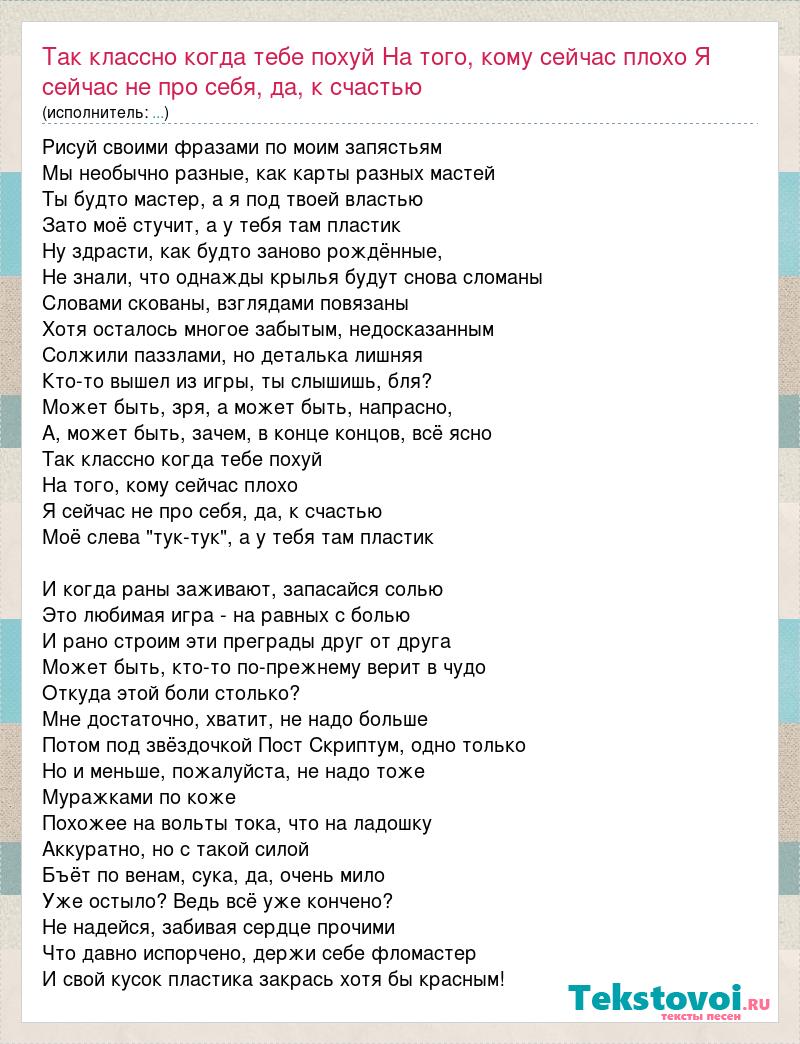 Главная→Исполнители→...→Так классно когда тебе похуй На того, кому сейчас плохо Я сейчас не про себя