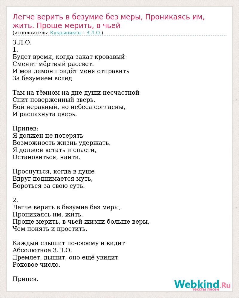 Главная→Исполнители→Кукрыниксы - З.Л.О.→Легче верить в безумие без меры, Проникаясь им, жить. Проще мерить, в чьей