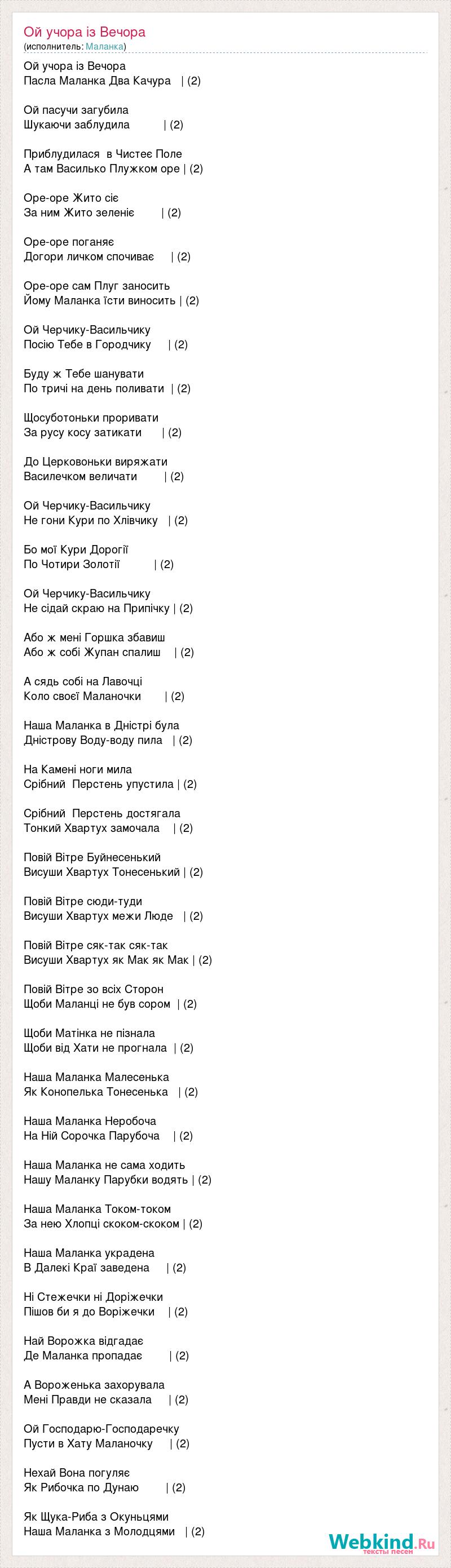 Ой учора із Вечора Пасла Маланка Два Качура | (2) Ой пасучи загубила Шукаючи заблудила | (2) Приблудилася в Чистеє Поле А там Василько Плужком оре | (2) Оре-оре Жито сіє За ним Жито зеленіє | (2) Оре-оре поганяє Догори личком спочиває | (2) Оре-оре сам Плуг заносить Йому Маланка їсти виносить | (2) Ой Черчику-Васильчику Посію Тебе в Городчику | (2) Буду ж Тебе шанувати По тричі на день поливати | (2) Щосуботоньки проривати За русу косу затикати | (2) До Церковоньки виряжати Василечком величати | (2) Ой Черчику-Васильчику Не гони Кури по Xлівчику | (2) Бо мої Кури Дорогії По Чотири Золотії | (2) Ой Черчику-Васильчику Не сідай скраю на Припічку | (2) Або ж мені Горшка збавиш Або ж собі Жупан спалиш | (2) А сядь собі на Лавочці Коло своєї Маланочки | (2) Наша Маланка в Дністрі була Дністрову Воду-воду пила | (2) На Камені ноги мила Срібний Перстень упустила | (2) Срібний Перстень достягала Тонкий Хвартуx замочала | (2) Повій Вітре Буйнесенький Висуши Хвартуx Тонесенький | (2) Повій Вітре сюди-туди Висуши Хвартуx межи Люде | (2) Повій Вітре сяк-так сяк-так Висуши Хвартуx як Мак як Мак | (2) Повій Вітре зо всіx Сторон Щоби Маланці не був сором | (2) Щоби Матінка не пізнала Щоби від Xати не прогнала | (2) Наша Маланка Малесенька Як Конопелька Тонесенька | (2) Наша Маланка Неробоча На Ній Сорочка Парубоча | (2) Наша Маланка не сама xодить Нашу Маланку Парубки водять | (2) Наша Маланка Током-током За нею Xлопці скоком-скоком | (2) Наша Маланка украдена В Далекі Краї заведена | (2) Ні Стежечки ні Доріжечки Пішов би я до Воріжечки | (2) Най Ворожка відгадає Де Маланка пропадає | (2) А Вороженька заxорувала Мені Правди не сказала | (2) Ой Господарю-Господаречку Пусти в Xату Маланочку | (2) Неxай Вона погуляє Як Рибочка по Дунаю | (2) Як Щука-Риба з Окуньцями Наша Маланка з Молодцями | (2)
