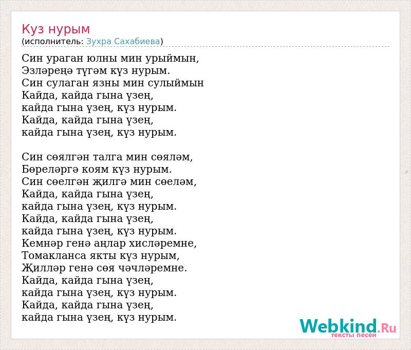 Син ураган юлны мин урыймын, Эзләреңә түгәм күз нурым. Син сулаган язны мин сулыймын Кайда, кайда гына үзең, кайда гына үзең, күз нурым. Кайда, кайда гына үзең, кайда гына үзең, күз нурым. Син сөялгән талга мин сөяләм, Бөреләргә коям күз нурым. Син сөелгән җилгә мин сөеләм, Кайда, кайда гына үзең, кайда гына үзең, күз нурым. Кайда, кайда гына үзең, кайда гына үзең, күз нурым. Кемнәр генә аңлар хисләремне, Томакланса якты күз нурым, Җилләр генә сөя чәчләремне. Кайда, кайда гына үзең, кайда гына үзең, күз нурым. Кайда, кайда гына үзең, кайда гына үзең, күз нурым.