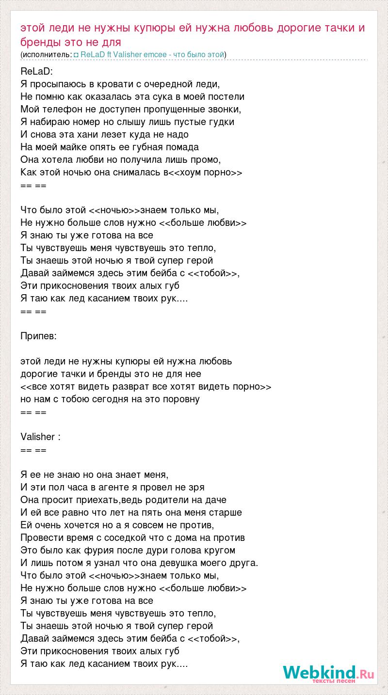 ReLaD: Я просыпаюсь в кровати с очередной леди, Не помню как оказалась эта сука в моей постели Мой телефон не доступен пропущенные звонки, Я набираю номер но слышу лишь пустые гудки И снова эта хани лезет куда не надо На моей майке опять ее губная помада Она хотела любви но получила лишь промо, Как этой ночью она снималась в<<хоум порно>> == == Что было этой <<ночью>>знаем только мы, Не нужно больше слов нужно <<больше любви>> Я знаю ты уже готова на все Ты чувствуешь меня чувствуешь это тепло, Ты знаешь этой ночью я твой супер герой Давай займемся здесь этим бейба с <<тобой>>, Эти прикосновения твоих алых губ Я таю как лед касанием твоих рук.... == == Припев: этой леди не нужны купюры ей нужна любовь дорогие тачки и бренды это не для нее <<все хотят видеть разврат все хотят видеть порно>> но нам с тобою сегодня на это поровну == == Valisher : == == Я ее не знаю но она знает меня, И эти пол часа в агенте я провел не зря Она просит приехать,ведь родители на даче И ей все равно что лет на пять она меня старше Ей очень хочется но а я совсем не против, Провести время с соседкой что с дома на против Это было как фурия после дури голова кругом И лишь потом я узнал что она девушка моего друга. Что было этой <<ночью>>знаем только мы, Не нужно больше слов нужно <<больше любви>> Я знаю ты уже готова на все Ты чувствуешь меня чувствуешь это тепло, Ты знаешь этой ночью я твой супер герой Давай займемся здесь этим бейба с <<тобой>>, Эти прикосновения твоих алых губ Я таю как лед касанием твоих рук....