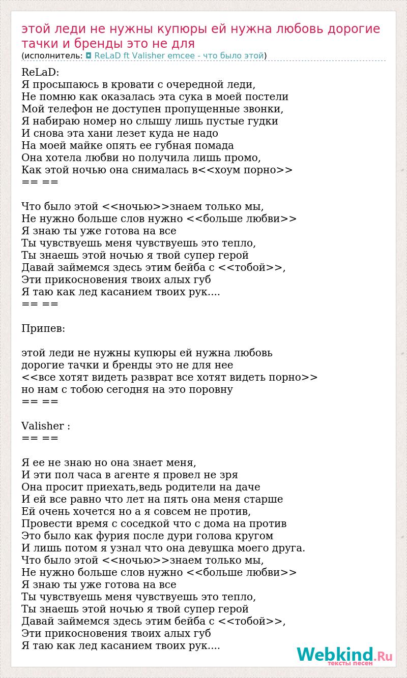 ReLaD: Я просыпаюсь в кровати с очередной леди, Не помню как оказалась эта сука в моей постели Мой телефон не доступен пропущенные звонки, Я набираю номер но слышу лишь пустые гудки И снова эта хани лезет куда не надо На моей майке опять ее губная помада Она хотела любви но получила лишь промо, Как этой ночью она снималась в<<хоум порно>> == == Что было этой <<ночью>>знаем только мы, Не нужно больше слов нужно <<больше любви>> Я знаю ты уже готова на все Ты чувствуешь меня чувствуешь это тепло, Ты знаешь этой ночью я твой супер герой Давай займемся здесь этим бейба с <<тобой>>, Эти прикосновения твоих алых губ Я таю как лед касанием твоих рук.... == == Припев: этой леди не нужны купюры ей нужна любовь дорогие тачки и бренды это не для нее <<все хотят видеть разврат все хотят видеть порно>> но нам с тобою сегодня на это поровну == == Valisher : == == Я ее не знаю но она знает меня, И эти пол часа в агенте я провел не зря Она просит приехать,ведь родители на даче И ей все равно что лет на пять она меня старше Ей очень хочется но а я совсем не против, Провести время с соседкой что с дома на против Это было как фурия после дури голова кругом И лишь потом я узнал что она девушка моего друга. Что было этой <<ночью>>знаем только мы, Не нужно больше слов нужно <<больше любви>> Я знаю ты уже готова на все Ты чувствуешь меня чувствуешь это тепло, Ты знаешь этой ночью я твой супер герой Давай займемся здесь этим бейба с <<тобой>>, Эти прикосновения твоих алых губ Я таю как лед касанием твоих рук....