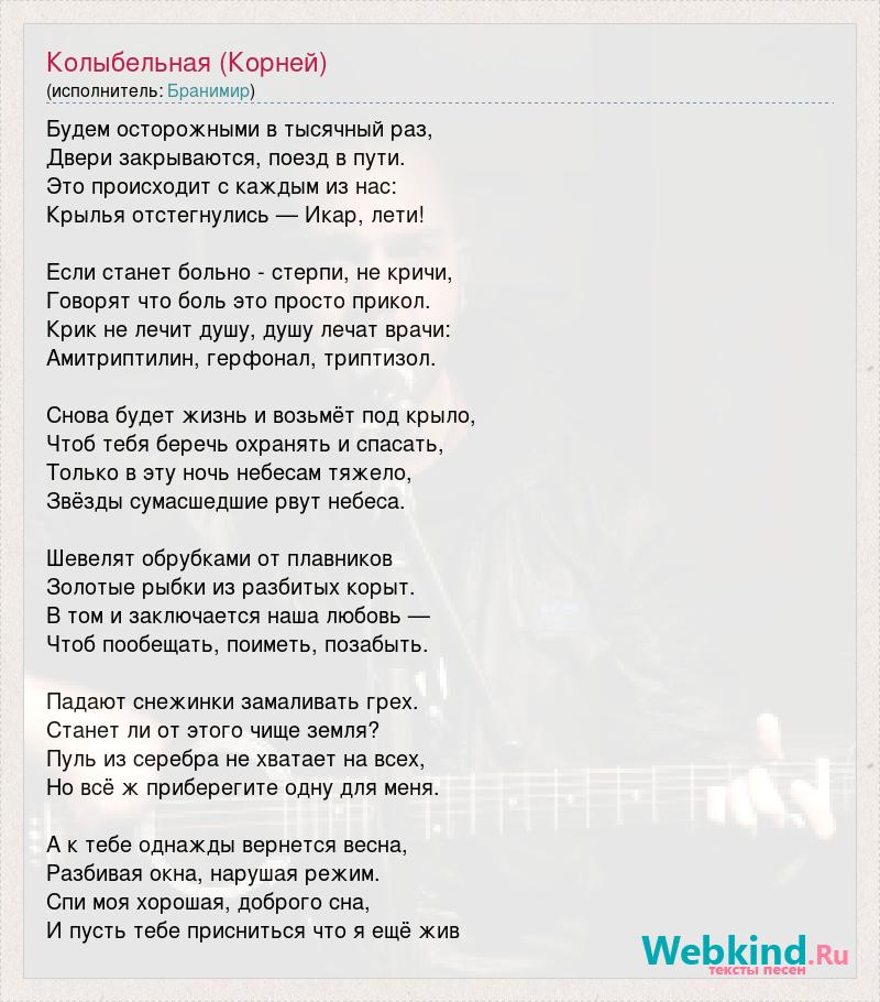 Будем осторожными в тысячный раз, Двери закрываются, поезд в пути. Это происходит с каждым из нас: Крылья отстегнулись — Икар, лети! Если станет больно - стерпи, не кричи, Говорят что боль это просто прикол. Крик не лечит душу, душу лечат врачи: Амитриптилин, герфонал, триптизол. Снова будет жизнь и возьмёт под крыло, Чтоб тебя беречь охранять и спасать, Только в эту ночь небесам тяжело, Звёзды сумасшедшие рвут небеса. Шевелят обрубками от плавников Золотые рыбки из разбитых корыт. В том и заключается наша любовь — Чтоб пообещать, поиметь, позабыть. Падают снежинки замаливать грех. Станет ли от этого чище земля? Пуль из серебра не хватает на всех, Но всё ж приберегите одну для меня. А к тебе однажды вернется весна, Разбивая окна, нарушая режим. Спи моя хорошая, доброго сна, И пусть тебе присниться что я ещё жив