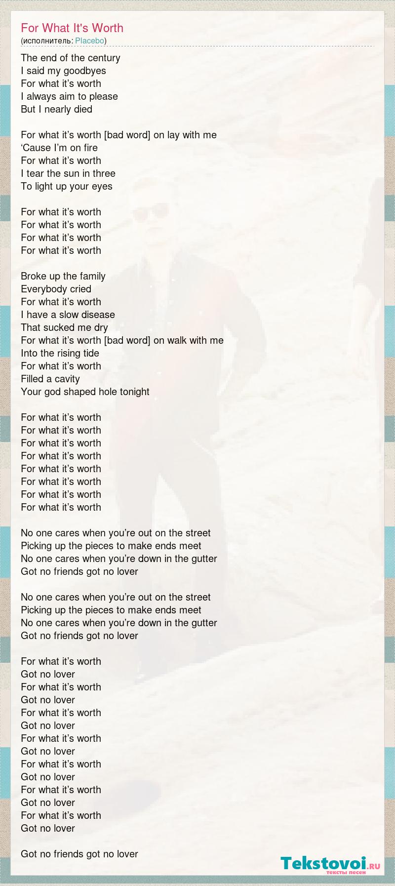 The end of the century I said my goodbyes For what it’s worth I always aim to please But I nearly died For what it’s worth Come on lay with me ‘Cause I’m on fire For what it’s worth I tear the sun in three To light up your eyes For what it’s worth For what it’s worth For what it’s worth For what it’s worth Broke up the family Everybody cried For what it’s worth I have a slow disease That sucked me dry For what it’s worth Come on walk with me Into the rising tide For what it’s worth Filled a cavity Your god shaped hole tonight For what it’s worth For what it’s worth For what it’s worth For what it’s worth For what it’s worth For what it’s worth For what it’s worth For what it’s worth No one cares when you’re out on the street Picking up the pieces to make ends meet No one cares when you’re down in the gutter Got no friends got no lover No one cares when you’re out on the street Picking up the pieces to make ends meet No one cares when you’re down in the gutter Got no friends got no lover For what it’s worth Got no lover For what it’s worth Got no lover For what it’s worth Got no lover For what it’s worth Got no lover For what it’s worth Got no lover For what it’s worth Got no lover For what it’s worth Got no lover Got no friends got no lover
