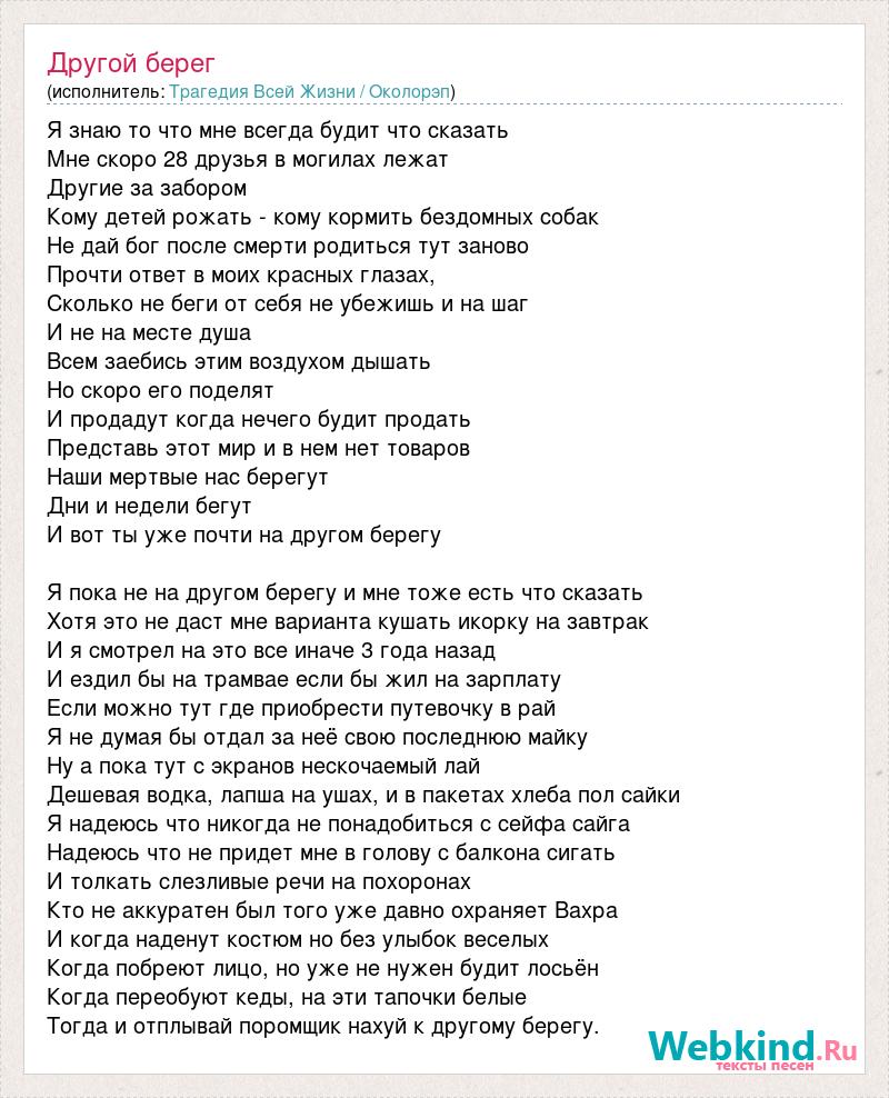 Я знаю то что мне всегда будит что сказать Мне скоро 28 друзья в могилах лежат Другие за забором Кому детей рожать - кому кормить бездомных собак Не дай бог после смерти родиться тут заново Прочти ответ в моих красных глазах, Сколько не беги от себя не убежишь и на шаг И не на месте душа Всем заебись этим воздухом дышать Но скоро его поделят И продадут когда нечего будит продать Представь этот мир и в нем нет товаров Наши мертвые нас берегут Дни и недели бегут И вот ты уже почти на другом берегу Я пока не на другом берегу и мне тоже есть что сказать Хотя это не даст мне варианта кушать икорку на завтрак И я смотрел на это все иначе 3 года назад И ездил бы на трамвае если бы жил на зарплату Если можно тут где приобрести путевочку в рай Я не думая бы отдал за неё свою последнюю майку Ну а пока тут с экранов нескочаемый лай Дешевая водка, лапша на ушах, и в пакетах хлеба пол сайки Я надеюсь что никогда не понадобиться с сейфа сайга Надеюсь что не придет мне в голову с балкона сигать И толкать слезливые речи на похоронах Кто не аккуратен был того уже давно охраняет Вахра И когда наденут костюм но без улыбок веселых Когда побреют лицо, но уже не нужен будит лосьён Когда переобуют кеды, на эти тапочки белые Тогда и отплывай поромщик нахуй к другому берегу.