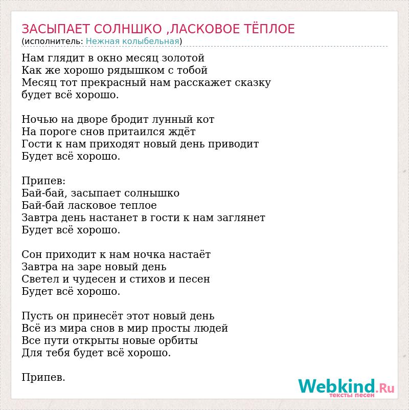 Нам глядит в окно месяц золотой Как же хорошо рядышком с тобой Месяц тот прекрасный нам расскажет сказку будет всё хорошо. Ночью на дворе бродит лунный кот На пороге снов притаился ждёт Гости к нам приходят новый день приводит Будет всё хорошо. Припев: Бай-бай, засыпает солнышко Бай-бай ласковое теплое Завтра день настанет в гости к нам заглянет Будет всё хорошо. Сон приходит к нам ночка настаёт Завтра на заре новый день Светел и чудесен и стихов и песен Будет всё хорошо. Пусть он принесёт этот новый день Всё из мира снов в мир просты людей Все пути открыты новые орбиты Для тебя будет всё хорошо. Припев.