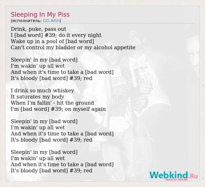 Drink, puke, pass out I [bad word] #39; do it every night Wake up in a pool of [bad word] Can't control my bladder or my alcohol appetite Sleepin' in my [bad word] I'm wakin' up all wet And when it's time to take a [bad word] It's bloody [bad word] #39; red I drink so much whiskey It saturates my body When I'm fallin' - hit the ground I'm [bad word] #39; on myself again Sleepin' in my [bad word] I'm wakin' up all wet And when it's time to take a [bad word] It's bloody [bad word] #39; red Sleepin' in my [bad word] I'm wakin' up all wet And when it's time to take a [bad word] It's bloody [bad word] #39; red
