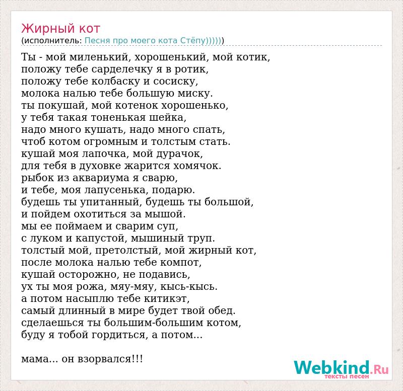 Ты - мой миленький, хорошенький, мой котик, положу тебе сарделечку я в ротик, положу тебе колбаску и сосиску, молока налью тебе большую миску. ты покушай, мой котенок хорошенько, у тебя такая тоненькая шейка, надо много кушать, надо много спать, чтоб котом огромным и толстым стать. кушай моя лапочка, мой дурачок, для тебя в духовке жарится хомячок. рыбок из аквариума я сварю, и тебе, моя лапусенька, подарю. будешь ты упитанный, будешь ты большой, и пойдем охотиться за мышой. мы ее поймаем и сварим суп, с луком и капустой, мышиный труп. толстый мой, претолстый, мой жирный кот, после молока налью тебе компот, кушай осторожно, не подавись, ух ты моя рожа, мяу-мяу, кысь-кысь. а потом насыплю тебе китикэт, самый длинный в мире будет твой обед. сделаешься ты большим-большим котом, буду я тобой гордиться, а потом... мама... он взорвался!!!
