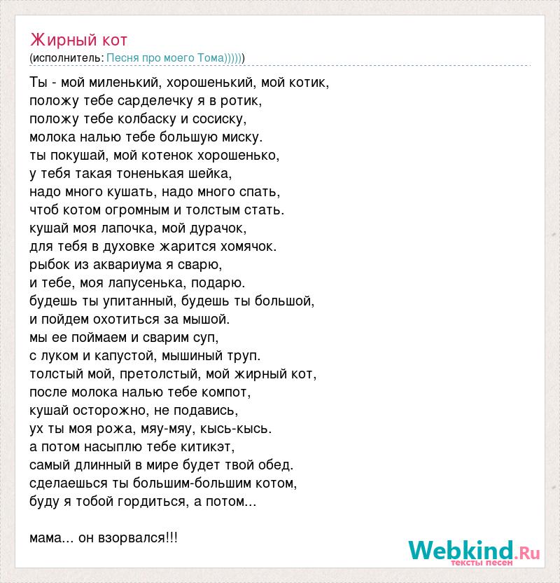 Ты - мой миленький, хорошенький, мой котик, положу тебе сарделечку я в ротик, положу тебе колбаску и сосиску, молока налью тебе большую миску. ты покушай, мой котенок хорошенько, у тебя такая тоненькая шейка, надо много кушать, надо много спать, чтоб котом огромным и толстым стать. кушай моя лапочка, мой дурачок, для тебя в духовке жарится хомячок. рыбок из аквариума я сварю, и тебе, моя лапусенька, подарю. будешь ты упитанный, будешь ты большой, и пойдем охотиться за мышой. мы ее поймаем и сварим суп, с луком и капустой, мышиный труп. толстый мой, претолстый, мой жирный кот, после молока налью тебе компот, кушай осторожно, не подавись, ух ты моя рожа, мяу-мяу, кысь-кысь. а потом насыплю тебе китикэт, самый длинный в мире будет твой обед. сделаешься ты большим-большим котом, буду я тобой гордиться, а потом... мама... он взорвался!!!