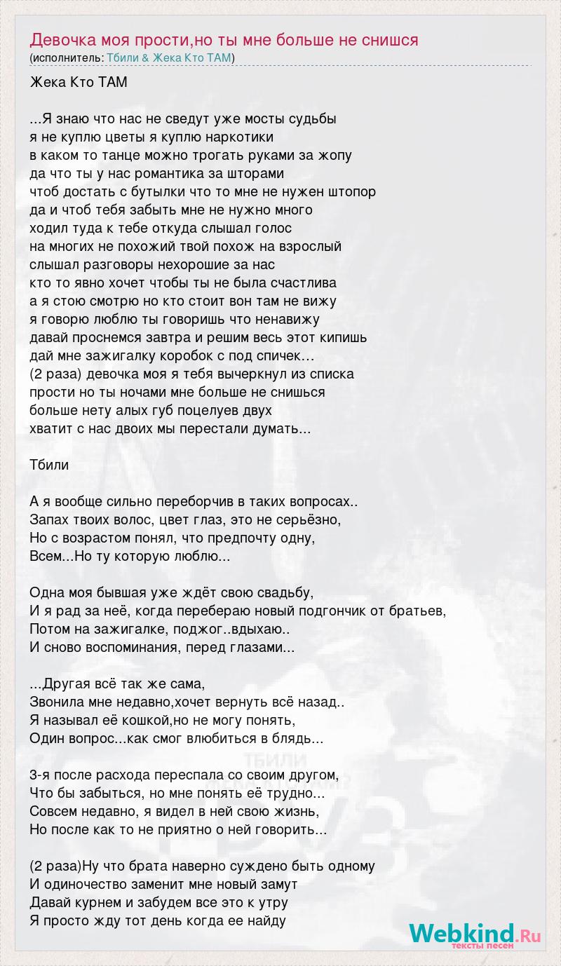 Жека Кто ТАМ ...Я знаю что нас не сведут уже мосты судьбы я не куплю цветы я куплю наркотики в каком то танце можно трогать руками за жопу да что ты у нас романтика за шторами чтоб достать с бутылки что то мне не нужен штопор да и чтоб тебя забыть мне не нужно много ходил туда к тебе откуда слышал голос на многих не похожий твой похож на взрослый слышал разговоры нехорошие за нас кто то явно хочет чтобы ты не была счастлива а я стою смотрю но кто стоит вон там не вижу я говорю люблю ты говоришь что ненавижу давай проснемся завтра и решим весь этот кипишь дай мне зажигалку коробок с под спичек… (2 раза) девочка моя я тебя вычеркнул из списка прости но ты ночами мне больше не снишься больше нету алых губ поцелуев двух хватит с нас двоих мы перестали думать... Тбили А я вообще сильно переборчив в таких вопросах.. Запах твоих волос, цвет глаз, это не серьёзно, Но с возрастом понял, что предпочту одну, Всем...Но ту которую люблю... Одна моя бывшая уже ждёт свою свадьбу, И я рад за неё, когда перебераю новый подгончик от братьев, Потом на зажигалке, поджог..вдыхаю.. И сново воспоминания, перед глазами... ...Другая всё так же сама, Звонила мне недавно,хочет вернуть всё назад.. Я называл её кошкой,но не могу понять, Один вопрос...как смог влюбиться в блядь... 3-я после расхода переспала со своим другом, Что бы забыться, но мне понять её трудно... Совсем недавно, я видел в ней свою жизнь, Но после как то не приятно о ней говорить... (2 раза)Ну что брата наверно суждено быть одному И одиночество заменит мне новый замут Давай курнем и забудем все это к утру Я просто жду тот день когда ее найду