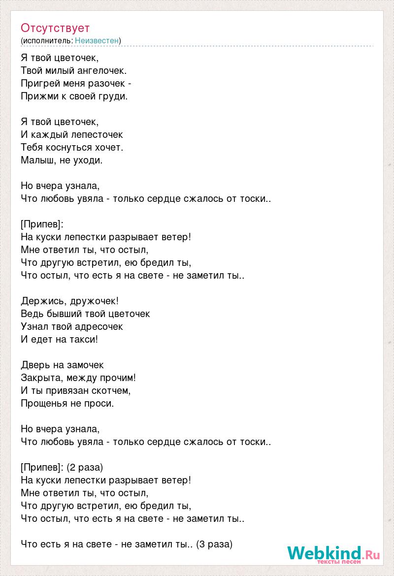 Я твой цветочек, Твой милый ангелочек. Пригрей меня разочек - Прижми к своей груди. Я твой цветочек, И каждый лепесточек Тебя коснуться хочет. Малыш, не уходи. Но вчера узнала, Что любовь увяла - только сердце сжалось от тоски.. [Припев]: На куски лепестки разрывает ветер! Мне ответил ты, что остыл, Что другую встретил, ею бредил ты, Что остыл, что есть я на свете - не заметил ты.. Держись, дружочек! Ведь бывший твой цветочек Узнал твой адресочек И едет на такси! Дверь на замочек Закрыта, между прочим! И ты привязан скотчем, Прощенья не проси. Но вчера узнала, Что любовь увяла - только сердце сжалось от тоски.. [Припев]: (2 раза) На куски лепестки разрывает ветер! Мне ответил ты, что остыл, Что другую встретил, ею бредил ты, Что остыл, что есть я на свете - не заметил ты.. Что есть я на свете - не заметил ты.. (3 раза)
