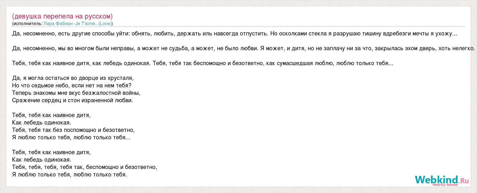 Да, несомненно, есть другие способы уйти: обнять, любить, держать иль навсегда отпустить. Но осколками стекла я разрушаю тишину вдребезги мечты я ухожу... Да, несомненно, мы во многом были неправы, а может не судьба, а может, не было любви. Я может, и дитя, но не заплачу ни за что, закрылась эхом дверь, хоть нелегко. Тебя, тебя как наивное дитя, как лебедь одинокая. Тебя, тебя так беспомощно и безответно, как сумасшедшая люблю, люблю только тебя... Да, я могла остаться во дворце из хрусталя, Но что седьмое небо, если нет на нем тебя? Теперь знакомы мне вкус безжалостной войны, Сражение сердец и стон израненной любви. Тебя, тебя как наивное дитя, Как лебедь одинокая. Тебя, тебя так без поспомощно и безответно, Я люблю только тебя, люблю только тебя... Тебя, тебя как наивное дитя, Как лебедь одинокая. Тебя, тебя, тебя, тебя так, беспомощно и безответно, Я люблю только тебя, люблю только тебя.