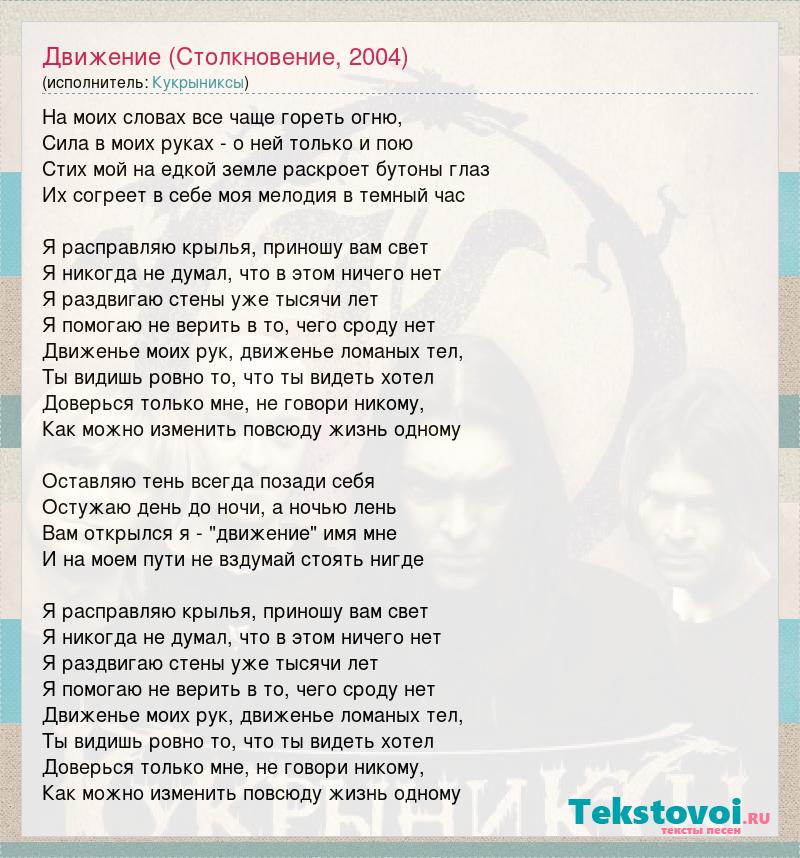 На моих словах все чаще гореть огню, Сила в моих руках - о ней только и пою Стих мой на едкой земле раскроет бутоны глаз Их согреет в себе моя мелодия в темный час Я расправляю крылья, приношу вам свет Я никогда не думал, что в этом ничего нет Я раздвигаю стены уже тысячи лет Я помогаю не верить в то, чего сроду нет Движенье моих рук, движенье ломаных тел, Ты видишь ровно то, что ты видеть хотел Доверься только мне, не говори никому, Как можно изменить повсюду жизнь одному Оставляю тень всегда позади себя Остужаю день до ночи, а ночью лень Вам открылся я - "движение" имя мне И на моем пути не вздумай стоять нигде Я расправляю крылья, приношу вам свет Я никогда не думал, что в этом ничего нет Я раздвигаю стены уже тысячи лет Я помогаю не верить в то, чего сроду нет Движенье моих рук, движенье ломаных тел, Ты видишь ровно то, что ты видеть хотел Доверься только мне, не говори никому, Как можно изменить повсюду жизнь одному