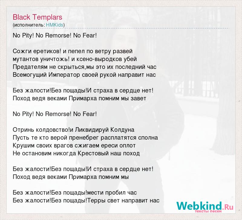 No Pity! No Remorse! No Fear! Сожги еретиков! и пепел по ветру развей мутантов уничтожь! и ксено-выродков убей Предателям не скрыться,мы это их последний час Всемогущий Император своей рукой направит нас Без жалости!Без пощады!И страха в сердце нет! Поход ведя веками Примарха помним мы завет No Pity! No Remorse! No Fear! Отринь колдовство!и Ликвидируй Колдуна Пусть те кто верой пренебрег расплатятся сполна Крушим своих врагов сжигаем ереси оплот Не остановим никогда Крестовый наш поход Без жалости!Без пощады!И страха в сердце нет! Поход ведя веками Примарха помним мы Без жалости!Без пощады!мести пробил час Без жалости!Без пощады!Терры свет направит нас