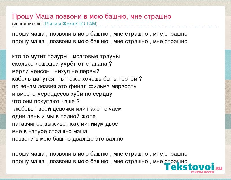 прошу маша , позвони в мою башню , мне страшно , мне страшно прошу маша , позвони в мою башню , мне страшно , мне страшно кто то мутит трауры , мозговые траумы сколько лошодей умрёт от стакана ? мерли менсон . нихуя не первый кабель данутся. ты тоже хочешь быть поэтом ? по венам лезвия это финал фильма мерзость и вместо мерседесов хуём по сердцу что они покупают чаше ? любовь твоей девочки или пакет с чаем одни день и мы в полной жопе нагавчиное выживет как минимум двое мне в натуре страшно маша позвони в мою башню дважде это важно прошу маша , позвони в мою башню , мне страшно , мне страшно прошу маша , позвони в мою башню , мне страшно , мне страшно