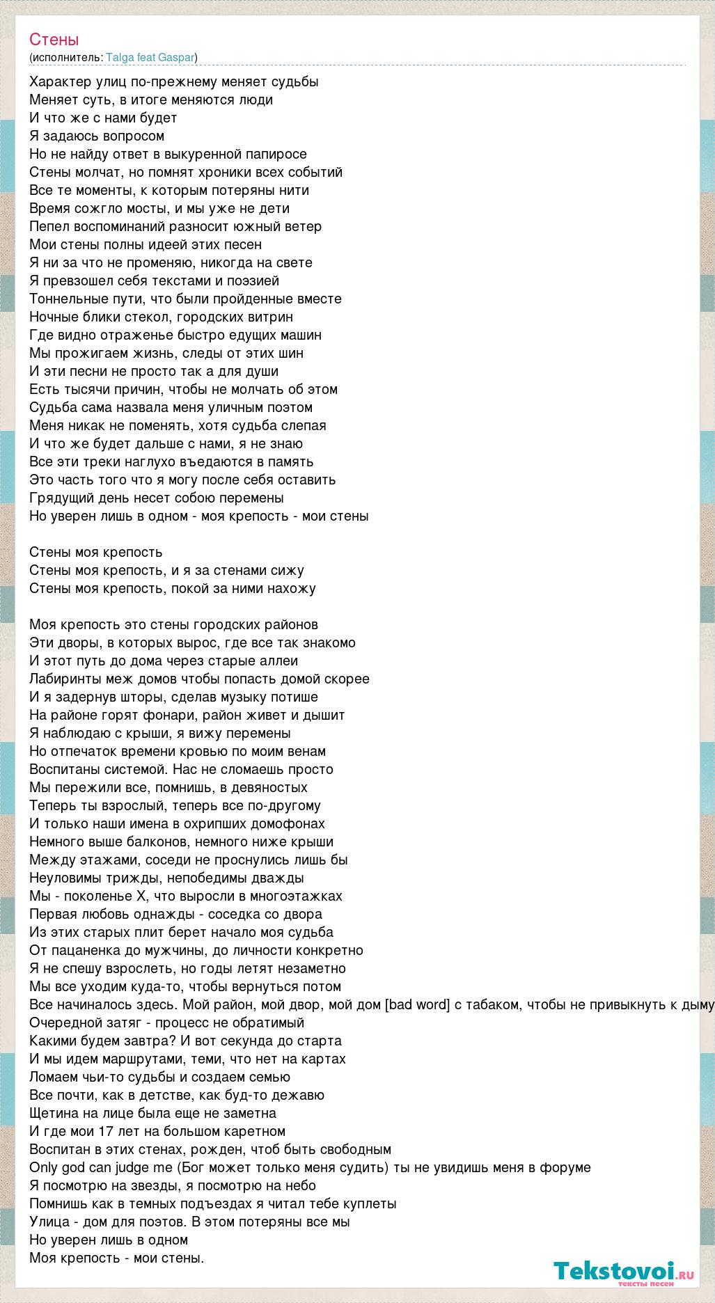 Характер улиц по-прежнему меняет судьбы Меняет суть, в итоге меняются люди И что же с нами будет Я задаюсь вопросом Но не найду ответ в выкуренной папиросе Стены молчат, но помнят хроники всех событий Все те моменты, к которым потеряны нити Время сожгло мосты, и мы уже не дети Пепел воспоминаний разносит южный ветер Мои стены полны идеей этих песен Я ни за что не променяю, никогда на свете Я превзошел себя текстами и поэзией Тоннельные пути, что были пройденные вместе Ночные блики стекол, городских витрин Где видно отраженье быстро едущих машин Мы прожигаем жизнь, следы от этих шин И эти песни не просто так а для души Есть тысячи причин, чтобы не молчать об этом Судьба сама назвала меня уличным поэтом Меня никак не поменять, хотя судьба слепая И что же будет дальше с нами, я не знаю Все эти треки наглухо въедаются в память Это часть того что я могу после себя оставить Грядущий день несет собою перемены Но уверен лишь в одном - моя крепость - мои стены Стены моя крепость Стены моя крепость, и я за стенами сижу Стены моя крепость, покой за ними нахожу Моя крепость это стены городских районов Эти дворы, в которых вырос, где все так знакомо И этот путь до дома через старые аллеи Лабиринты меж домов чтобы попасть домой скорее И я задернув шторы, сделав музыку потише На районе горят фонари, район живет и дышит Я наблюдаю с крыши, я вижу перемены Но отпечаток времени кровью по моим венам Воспитаны системой. Нас не сломаешь просто Мы пережили все, помнишь, в девяностых Теперь ты взрослый, теперь все по-другому И только наши имена в охрипших домофонах Немного выше балконов, немного ниже крыши Между этажами, соседи не проснулись лишь бы Неуловимы трижды, непобедимы дважды Мы - поколенье X, что выросли в многоэтажках Первая любовь однажды - соседка со двора Из этих старых плит берет начало моя судьба От пацаненка до мужчины, до личности конкретно Я не спешу взрослеть, но годы летят незаметно Мы все уходим куда-то, чтобы вернуться потом Все начиналось здесь. Мой район, мой двор, мой дом [bad word] с табаком, чтобы не привыкнуть к дыму Очередной затяг - процесс не обратимый Какими будем завтра? И вот секунда до старта И мы идем маршрутами, теми, что нет на картах Ломаем чьи-то судьбы и создаем семью Все почти, как в детстве, как буд-то дежавю Щетина на лице была еще не заметна И где мои 17 лет на большом каретном Воспитан в этих стенах, рожден, чтоб быть свободным Only god can judge me (Бог может только меня судить) ты не увидишь меня в форуме Я посмотрю на звезды, я посмотрю на небо Помнишь как в темных подъездах я читал тебе куплеты Улица - дом для поэтов. В этом потеряны все мы Но уверен лишь в одном Моя крепость - мои стены.