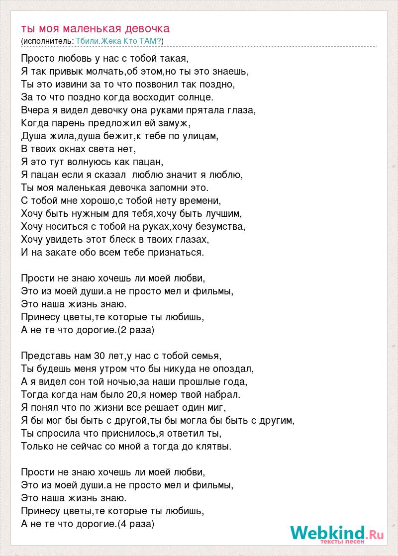 Просто любовь у нас с тобой такая, Я так привык молчать,об этом,но ты это знаешь, Ты это извини за то что позвонил так поздно, За то что поздно когда восходит солнце. Вчера я видел девочку она руками прятала глаза, Когда парень предложил ей замуж, Душа жила,душа бежит,к тебе по улицам, В твоих окнах света нет, Я это тут волнуюсь как пацан, Я пацан если я сказал люблю значит я люблю, Ты моя маленькая девочка запомни это. С тобой мне хорошо,с тобой нету времени, Хочу быть нужным для тебя,хочу быть лучшим, Хочу носиться с тобой на руках,хочу безумства, Хочу увидеть этот блеск в твоих глазах, И на закате обо всем тебе признаться. Прости не знаю хочешь ли моей любви, Это из моей души.а не просто мел и фильмы, Это наша жизнь знаю. Принесу цветы,те которые ты любишь, А не те что дорогие.(2 раза) Представь нам 30 лет,у нас с тобой семья, Ты будешь меня утром что бы никуда не опоздал, А я видел сон той ночью,за наши прошлые года, Тогда когда нам было 20,я номер твой набрал. Я понял что по жизни все решает один миг, Я бы мог бы быть с другой,ты бы могла бы быть с другим, Ты спросила что приснилось,я ответил ты, Только не сейчас со мной а тогда до клятвы. Прости не знаю хочешь ли моей любви, Это из моей души.а не просто мел и фильмы, Это наша жизнь знаю. Принесу цветы,те которые ты любишь, А не те что дорогие.(4 раза)