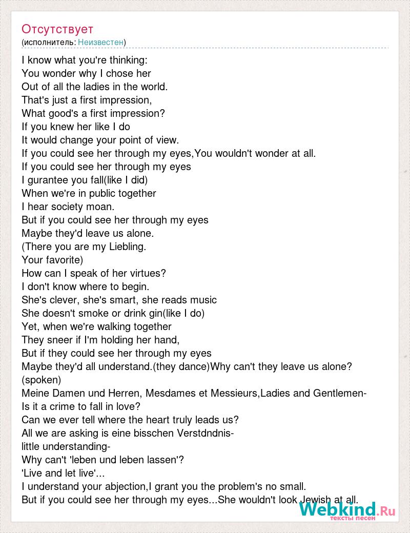 I know what you're thinking: You wonder why I chose her Out of all the ladies in the world. That's just a first impression, What good's a first impression? If you knew her like I do It would change your point of view. If you could see her through my eyes,You wouldn't wonder at all. If you could see her through my eyes I gurantee you fall(like I did) When we're in public together I hear society moan. But if you could see her through my eyes Maybe they'd leave us alone. (There you are my Liebling. Your favorite) How can I speak of her virtues? I don't know where to begin. She's clever, she's smart, she reads music She doesn't smoke or drink gin(like I do) Yet, when we're walking together They sneer if I'm holding her hand, But if they could see her through my eyes Maybe they'd all understand.(they dance)Why can't they leave us alone? (spoken) Meine Damen und Herren, Mesdames et Messieurs,Ladies and Gentlemen- Is it a crime to fall in love? Can we ever tell where the heart truly leads us? All we are asking is eine bisschen Verstdndnis- little understanding- Why can't 'leben und leben lassen'? 'Live and let live'... I understand your abjection,I grant you the problem's no small. But if you could see her through my eyes...She wouldn't look Jewish at all.