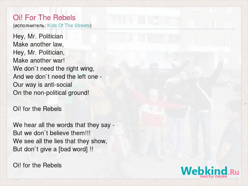 Hey, Mr. Politician Make another law, Hey, Mr. Politician, Make another war! We don`t need the right wing, And we don`t need the left one - Our way is anti-social On the non-political ground! Oi! for the Rebels We hear all the words that they say - But we don`t believe them!!! We see all the lies that they show, But don`t give a [bad word] !! Oi! for the Rebels