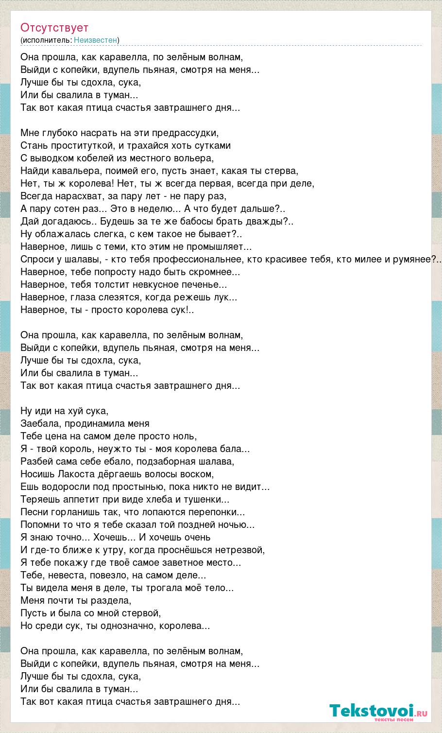 Она прошла, как каравелла, по зелёным волнам, Выйди с копейки, вдупель пьяная, смотря на меня... Лучше бы ты сдохла, сука, Или бы свалила в туман... Так вот какая птица счастья завтрашнего дня... Мне глубоко насрать на эти предрассудки, Стань проституткой, и трахайся хоть сутками С выводком кобелей из местного вольера, Найди кавальера, поимей его, пусть знает, какая ты стерва, Нет, ты ж королева! Нет, ты ж всегда первая, всегда при деле, Всегда нарасхват, за пару лет - не пару раз, А пару сотен раз... Это в неделю... А что будет дальше?.. Дай догадаюсь.. Будешь за те же бабосы брать дважды?.. Ну облажалась слегка, с кем такое не бывает?.. Наверное, лишь с теми, кто этим не промышляет... Спроси у шалавы, - кто тебя профессиональнее, кто красивее тебя, кто милее и румянее?.. Наверное, тебе попросту надо быть скромнее... Наверное, тебя толстит невкусное печенье... Наверное, глаза слезятся, когда режешь лук... Наверное, ты - просто королева сук!.. Она прошла, как каравелла, по зелёным волнам, Выйди с копейки, вдупель пьяная, смотря на меня... Лучше бы ты сдохла, сука, Или бы свалила в туман... Так вот какая птица счастья завтрашнего дня... Ну иди на хуй сука, Заебала, продинамила меня Тебе цена на самом деле просто ноль, Я - твой король, неужто ты - моя королева бала... Разбей сама себе ебало, подзаборная шалава, Носишь Лакоста дёргаешь волосы воском, Ешь водоросли под простынью, пока никто не видит... Теряешь аппетит при виде хлеба и тушенки... Песни горланишь так, что лопаются перепонки... Попомни то что я тебе сказал той поздней ночью... Я знаю точно... Хочешь... И хочешь очень И где-то ближе к утру, когда проснёшься нетрезвой, Я тебе покажу где твоё самое заветное место... Тебе, невеста, повезло, на самом деле... Ты видела меня в деле, ты трогала моё тело... Меня почти ты раздела, Пусть и была со мной стервой, Но среди сук, ты однозначно, королева... Она прошла, как каравелла, по зелёным волнам, Выйди с копейки, вдупель пьяная, смотря на меня... Лучше бы ты сдохла, сука, Или бы свалила в туман... Так вот какая птица счастья завтрашнего дня...