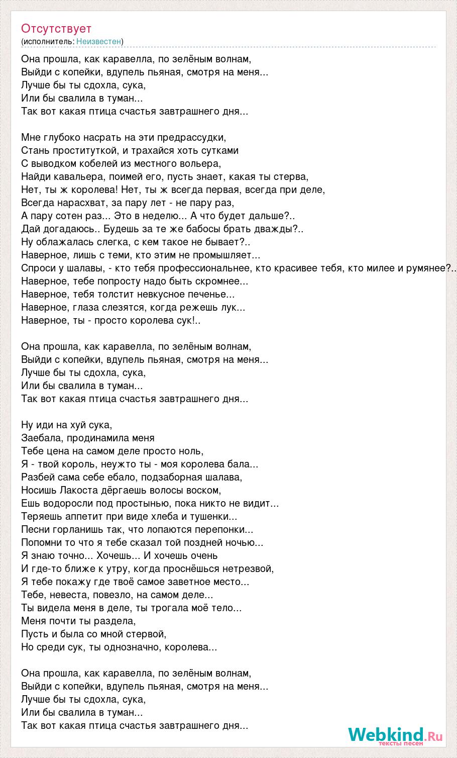Она прошла, как каравелла, по зелёным волнам, Выйди с копейки, вдупель пьяная, смотря на меня... Лучше бы ты сдохла, сука, Или бы свалила в туман... Так вот какая птица счастья завтрашнего дня... Мне глубоко насрать на эти предрассудки, Стань проституткой, и трахайся хоть сутками С выводком кобелей из местного вольера, Найди кавальера, поимей его, пусть знает, какая ты стерва, Нет, ты ж королева! Нет, ты ж всегда первая, всегда при деле, Всегда нарасхват, за пару лет - не пару раз, А пару сотен раз... Это в неделю... А что будет дальше?.. Дай догадаюсь.. Будешь за те же бабосы брать дважды?.. Ну облажалась слегка, с кем такое не бывает?.. Наверное, лишь с теми, кто этим не промышляет... Спроси у шалавы, - кто тебя профессиональнее, кто красивее тебя, кто милее и румянее?.. Наверное, тебе попросту надо быть скромнее... Наверное, тебя толстит невкусное печенье... Наверное, глаза слезятся, когда режешь лук... Наверное, ты - просто королева сук!.. Она прошла, как каравелла, по зелёным волнам, Выйди с копейки, вдупель пьяная, смотря на меня... Лучше бы ты сдохла, сука, Или бы свалила в туман... Так вот какая птица счастья завтрашнего дня... Ну иди на хуй сука, Заебала, продинамила меня Тебе цена на самом деле просто ноль, Я - твой король, неужто ты - моя королева бала... Разбей сама себе ебало, подзаборная шалава, Носишь Лакоста дёргаешь волосы воском, Ешь водоросли под простынью, пока никто не видит... Теряешь аппетит при виде хлеба и тушенки... Песни горланишь так, что лопаются перепонки... Попомни то что я тебе сказал той поздней ночью... Я знаю точно... Хочешь... И хочешь очень И где-то ближе к утру, когда проснёшься нетрезвой, Я тебе покажу где твоё самое заветное место... Тебе, невеста, повезло, на самом деле... Ты видела меня в деле, ты трогала моё тело... Меня почти ты раздела, Пусть и была со мной стервой, Но среди сук, ты однозначно, королева... Она прошла, как каравелла, по зелёным волнам, Выйди с копейки, вдупель пьяная, смотря на меня... Лучше бы ты сдохла, сука, Или бы свалила в туман... Так вот какая птица счастья завтрашнего дня...
