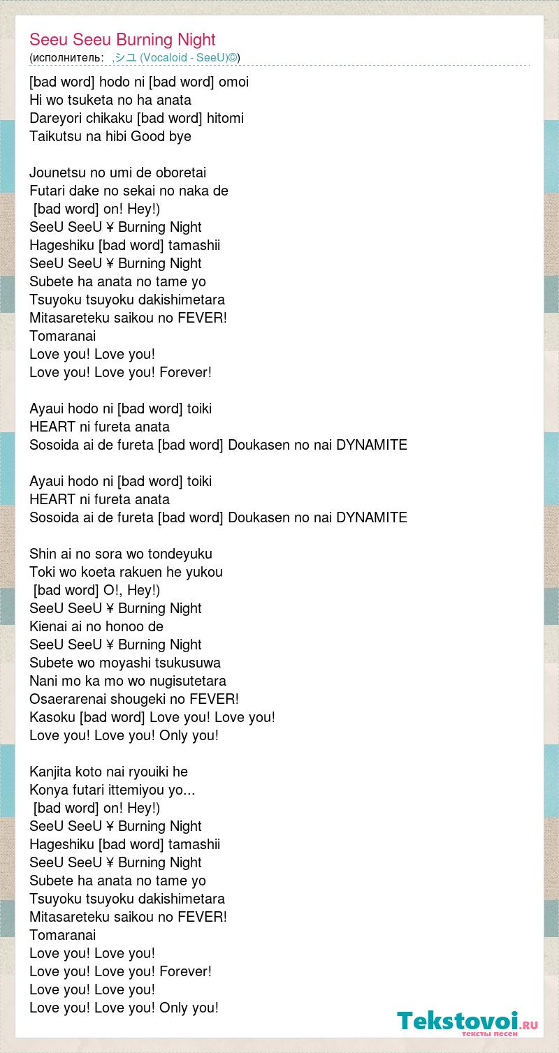 SMotomeru hodo ni takamaru omoi Hi wo tsuketa no ha anata Dareyori chikaku mitsumeru hitomi Taikutsu na hibi Good bye Jounetsu no umi de oboretai Futari dake no sekai no naka de (Come on! Hey!) SeeU SeeU ¥ Burning Night Hageshiku moeru tamashii SeeU SeeU ¥ Burning Night Subete ha anata no tame yo Tsuyoku tsuyoku dakishimetara Mitasareteku saikou no FEVER! Tomaranai Love you! Love you! Love you! Love you! Forever! Ayaui hodo ni kasanaru toiki HEART ni fureta anata Sosoida ai de fureta kuchibiru Doukasen no nai DYNAMITE Ayaui hodo ni kasanaru toiki HEART ni fureta anata Sosoida ai de fureta kuchibiru Doukasen no nai DYNAMITE Shin ai no sora wo tondeyuku Toki wo koeta rakuen he yukou (Come O!, Hey!) SeeU SeeU ¥ Burning Night Kienai ai no honoo de SeeU SeeU ¥ Burning Night Subete wo moyashi tsukusuwa Nani mo ka mo wo nugisutetara Osaerarenai shougeki no FEVER! Kasoku suru Love you! Love you! Love you! Love you! Only you! Kanjita koto nai ryouiki he Konya futari ittemiyou yo... (Come on! Hey!) SeeU SeeU ¥ Burning Night Hageshiku moeru tamashii SeeU SeeU ¥ Burning Night Subete ha anata no tame yo Tsuyoku tsuyoku dakishimetara Mitasareteku saikou no FEVER! Tomaranai Love you! Love you! Love you! Love you! Forever! Love you! Love you! Love you! Love you! Only you!