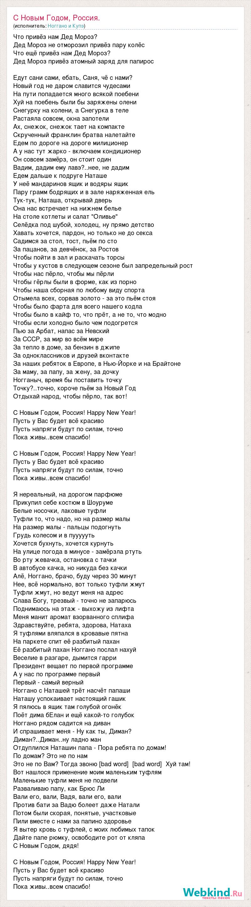 Что привёз нам Дед Мороз? Дед Мороз не отморозил привёз пару колёс Что ещё привёз нам Дед Мороз? Дед Мороз привёз атомный заряд для папирос Едут сани сами, ебать, Саня, чё с нами? Новый год не даром славится чудесами На пути попадается много всякой поебени Хуй на поебень были бы заряжены олени Снегурку на колени, а Снегурка в теле Растаяла совсем, окна запотели Ах, снежок, снежок тает на компакте Скрученный франклин братва налетайте Едем по дороге на дороге милиционер А у нас тут жарко - включаем кондиционер Он совсем замёрз, он стоит один Вадим, дадим ему лавэ?..нее, не дадим Едем дальше к подруге Наташе У неё мандаринов ящик и водяры ящик Пару грамм бодрящих и в зале наряженная ель Тук-тук, Наташа, открывай дверь Она нас встречает на нижнем белье На столе котлеты и салат "Оливье" Селёдка под шубой, холодец, ну прямо детство Хавать хочется, пардон, но только не до секса Садимся за стол, тост, пьём по сто За пацанов, за девчёнок, за Ростов Чтобы пойти в зал и раскачать торсы Чтобы у кустов в следующем сезоне был запредельный рост Чтобы нас пёрло, чтобы мы пёрли Чтобы гёрлы были в форме, как из порно Чтобы наша сборная по любому виду спорта Отымела всех, сорвав золото - за это пьём стоя Чтобы было фарта для всего нашего кодла Чтобы было в кайф то, что прёт, а не то, что модно Чтобы если холодно было чем подогрется Пью за Арбат, напас за Невский За СССР, за мир во всём мире За тепло в доме, за бензин в джипе За одноклассников и друзей вконтакте За наших ребяток в Европе, в Нью-Йорке и на Брайтоне За маму, за папу, за жену, за дочку Ногганыч, время бы поставить точку Точку?..точно, короче пьём за Новый Год Отдыхай народ, чтобы пёрло, так вот! С Новым Годом, Россия! Happy New Year! Пусть у Вас будет всё красиво Пусть напряги будут по силам, точно Пока живы..всем спасибо! С Новым Годом, Россия! Happy New Year! Пусть у Вас будет всё красиво Пусть напряги будут по силам, точно Пока живы..всем спасибо! Я нереальный, на дорогом парфюме Прикупил себе костюм в Шоуруме Белые носочки, лаковые туфли Туфли то, что надо, но на размер малы На размер малы - пальцы подогнуть Грудь колесом и в пуууууть Хочется бухнуть, хочется курнуть На улице погода в минусе - замёрзла ртуть Во рту жевачка, остановка с тачки В автобусе качка, но никуда без качки Алё, Ноггано, брачо, буду через 30 минут Нее, всё нормально, вот только туфли жмут Туфли жмут, но ведут меня на адрес Слава Богу, трезвый - точно не запарюсь Поднимаюсь на этаж - выхожу из лифта Меня манит аромат взорванного сплифа Здравствуйте, ребята, здорова, Натаха Я туфлями вляпался в кровавые пятна На паркете спит её разбитый пахан Её разбитый пахан Ноггано послал нахуй Веселие в разгаре, дымится гарри Президент вещает по первой программе А у нас по программе первый Первый - самый верный Ноггано с Наташей трёт насчёт папаши Наташу успокаивает настоящий гашик Я пялюсь в ящик там голубой огонёк Поёт дима бЕлан и ещё какой-то голубок Ноггано рядом садится на диван И спрашивает меня - Ну как ты, Диман? Диман?..Диман..ну ладно ман Отдуплился Наташин папа - Пора ребята по домам! По домам? Это не по нам Это не по Вам? Тогда звоню [bad word] [bad word] Хуй там! Вот нашлося применение моим маленьким туфлям Маленькие туфли меня не подвели Разваливаю папу, как Брюс Ли Вали его, вали, Вадя, вали его, вали Против бати за Вадю болеет даже Натали Потом были скорая, понятые, участковые Пили вме