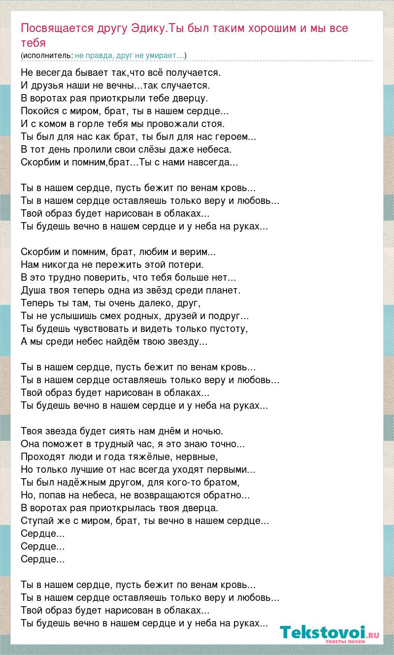 Не весегда бывает так,что всё получается. И друзья наши не вечны...так случается. В воротах рая приоткрыли тебе дверцу. Покойся с миром, брат, ты в нашем сердце... И с комом в горле тебя мы провожали стоя. Ты был для нас как брат, ты был для нас героем... В тот день пролили свои слёзы даже небеса. Скорбим и помним,брат...Ты с нами навсегда... Ты в нашем сердце, пусть бежит по венам кровь... Ты в нашем сердце оставляешь только веру и любовь... Твой образ будет нарисован в облаках... Ты будешь вечно в нашем сердце и у неба на руках... Скорбим и помним, брат, любим и верим... Нам никогда не пережить этой потери. В это трудно поверить, что тебя больше нет... Душа твоя теперь одна из звёзд среди планет. Теперь ты там, ты очень далеко, друг, Ты не услышишь смех родных, друзей и подруг... Ты будешь чувствовать и видеть только пустоту, А мы среди небес найдём твою звезду... Ты в нашем сердце, пусть бежит по венам кровь... Ты в нашем сердце оставляешь только веру и любовь... Твой образ будет нарисован в облаках... Ты будешь вечно в нашем сердце и у неба на руках... Твоя звезда будет сиять нам днём и ночью. Она поможет в трудный час, я это знаю точно... Проходят люди и года тяжёлые, нервные, Но только лучшие от нас всегда уходят первыми... Ты был надёжным другом, для кого-то братом, Но, попав на небеса, не возвращаются обратно... В воротах рая приоткрылась твоя дверца. Ступай же с миром, брат, ты вечно в нашем сердце... Сердце... Сердце... Сердце... Ты в нашем сердце, пусть бежит по венам кровь... Ты в нашем сердце оставляешь только веру и любовь... Твой образ будет нарисован в облаках... Ты будешь вечно в нашем сердце и у неба на руках...
